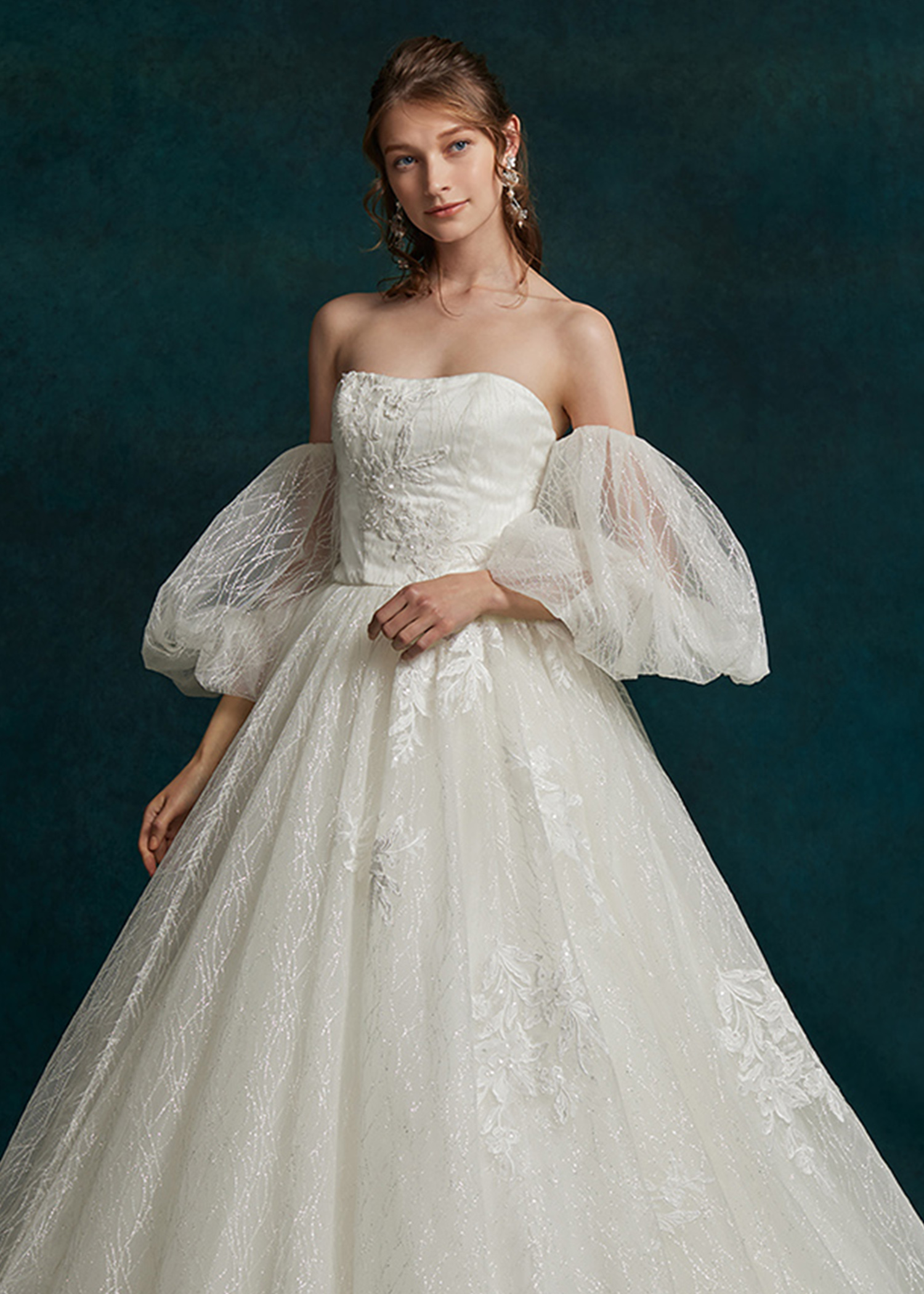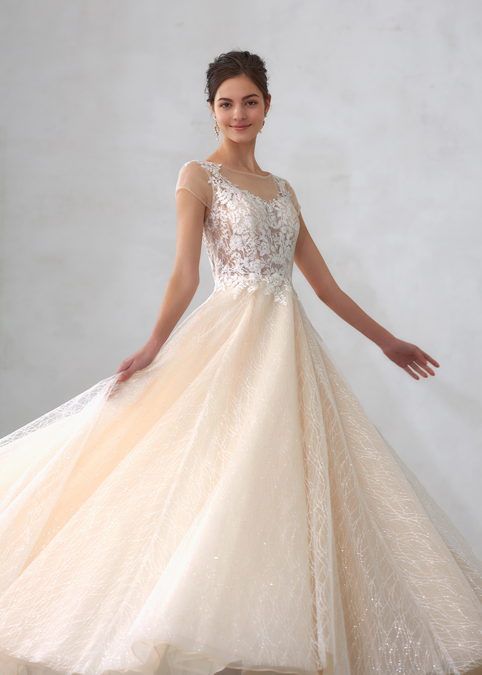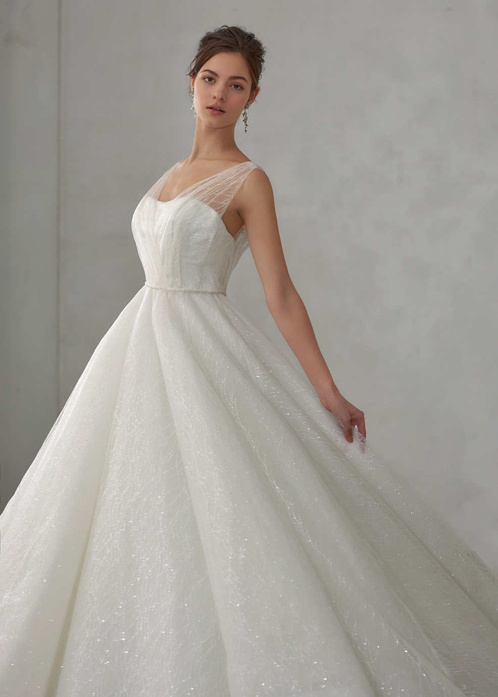 花嫁の上品なきらめきをドレス全体で表現した、軽やかで華やかなスタイル。
