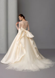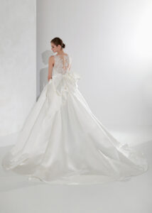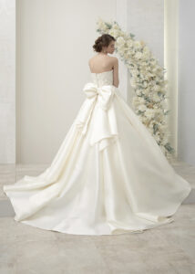交織サテンを贅沢に使用した上質なウェディングドレス。胸元の鋭いカッティングと背中のシースルーがエッジを利かせたモダンな印象は、大人花嫁様にお召しいただきたいドレス。ボリューミーな動きのあるバックリボンが華やかさと印象的な後ろ姿を演出します。