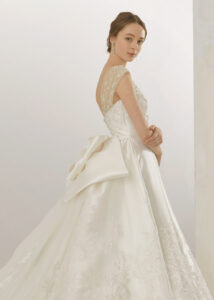 交織ミカドの張り感でスカートをたくしあげて作ったバックスタイルのリボンが特徴的なドレス。身頃はコンパクトさとすっきり感があるデザインに。ボレロには繊細なシャンテリーレースを使用し華奢な印象をプラスしています。ロイヤルウエディングを思わせつような上品さと華やかさを兼ね備えたウェディングドレス。