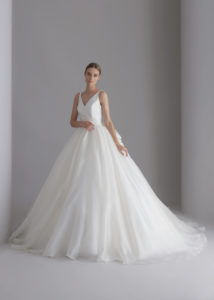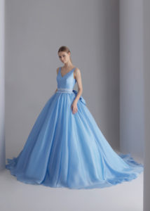 光沢のあるサテンとシルクオーガンジーをミックスした構築的なバックリボンが印象的なデザイン。都会的でシンプルなデザインにオフショルダーのレースボレロを羽織る事で、愛らしい雰囲気で誰にでも着こなせるようになっています。Vカットを施したネックラインはデコルテを美しく見せ、体型をカバーしたい花嫁様にもおすすめ。