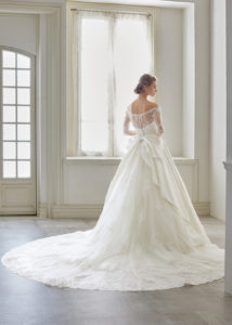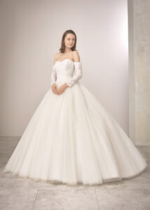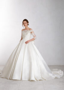 中厚のサテン地が柔らかい光沢感と優しい雰囲気を与え、繊細な柄のコードレースが印象的なドレス。長袖のオフショルダーヨークはデコルテラインをより綺麗に見せます。トレーンは取り外し式。2種類のレースがみせる美しいコントラストがポイント。クラシカルさもありつつ立体的なバックリボンでモダンな印象も与えたおしゃれな1着です。