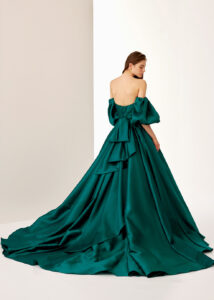 アシメトリーの身頃からつながるように、斜めによじったパフスリーブが印象的なドレス。スカートラインは生地をふんだんに使用して裾に向かい多く広がり、縦に流れるバックリボンは一段と華やか。トレンドのグリーンが美しいカラードレスです。
