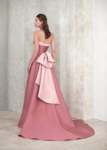 シンプルなデザインでありながらバイカラーの組み合わせと立体的なアシメトリーのバックリボンがおしゃれ。マキシ丈よりも少し短めのスカート丈はサンダルを合わせて足元を楽しめます。リゾート婚にもおすすめのピンクドレスです。