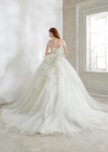 ミカドをたっぷりと使用した王道ビックプリンセスライン。リボン型のロールカラーは胸元を華奢に美しく魅せ、気になる二の腕ラインを綺麗に隠してくれます。フリルとお花を加工した2種類のレースをミックスしてクラシカルな中に可愛らしさをプラス。バックスタイルにはビックリボン+クルミ釦+ロングトレーンと花嫁様が大好きな要素をふんだんに取り入れた1着です。