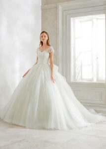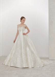 ミカドをたっぷりと使用した王道ビックプリンセスライン。リボン型のロールカラーは胸元を華奢に美しく魅せ、気になる二の腕ラインを綺麗に隠してくれます。フリルとお花を加工した2種類のレースをミックスしてクラシカルな中に可愛らしさをプラス。バックスタイルにはビックリボン+クルミ釦+ロングトレーンと花嫁様が大好きな要素をふんだんに取り入れた1着です。