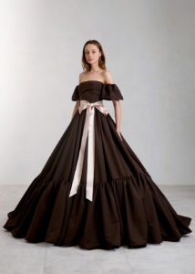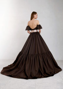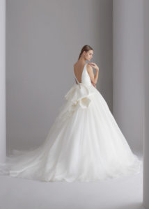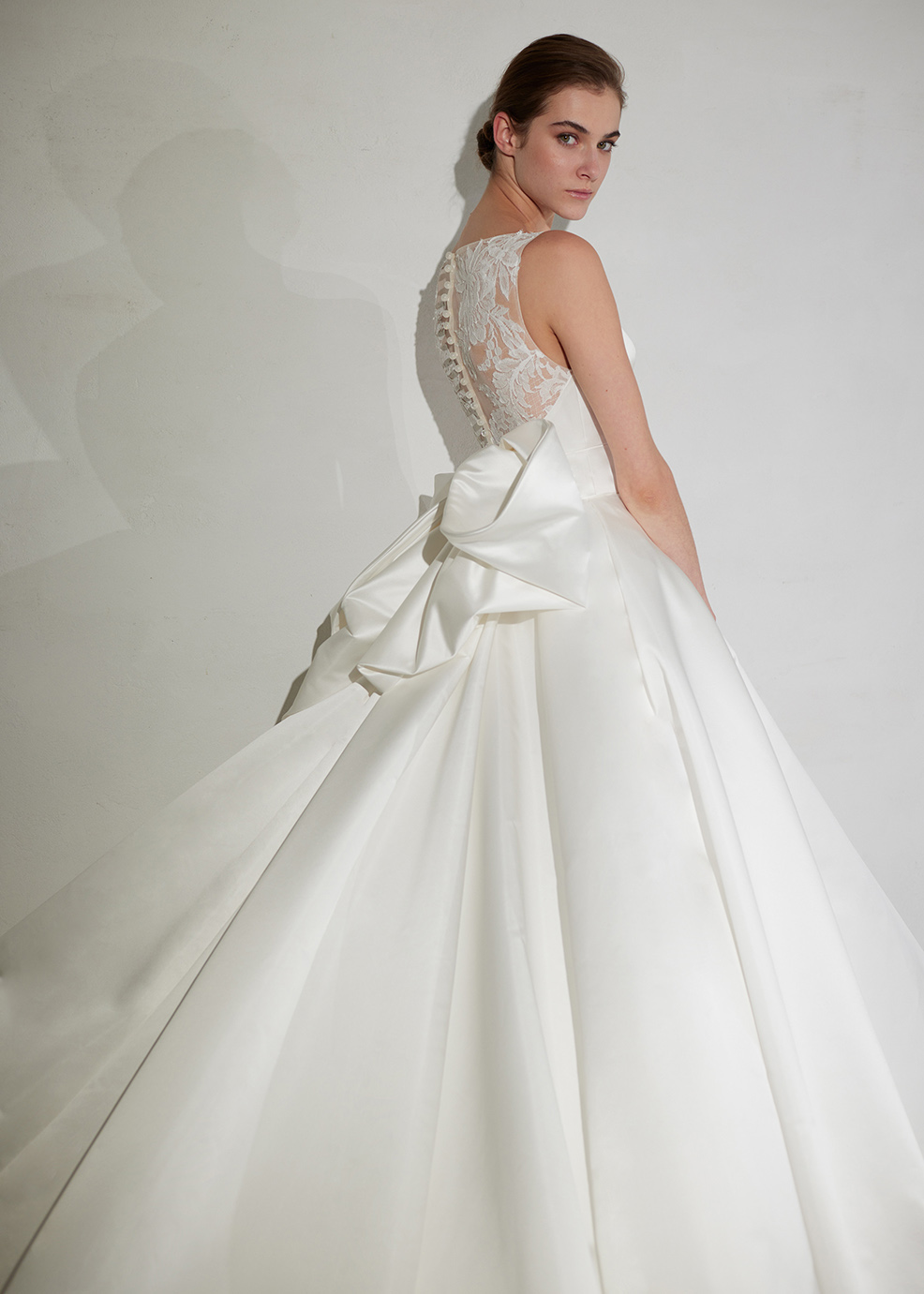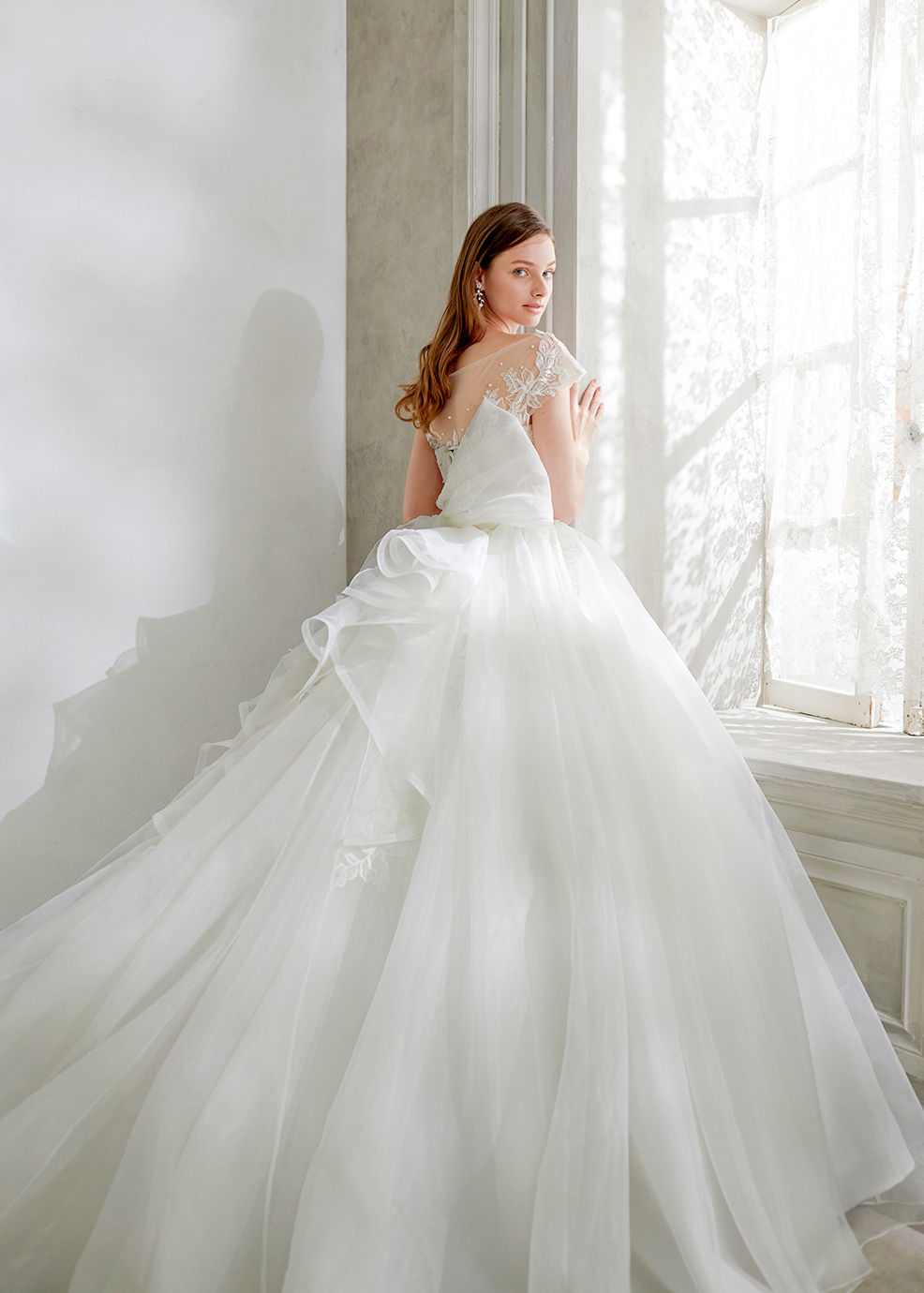 交織サテンを贅沢に使用した上質なウェディングドレス。胸元の鋭いカッティングと背中のシースルーがエッジを利かせたモダンな印象は、大人花嫁様にお召しいただきたいドレス。ボリューミーな動きのあるバックリボンが華やかさと印象的な後ろ姿を演出します。