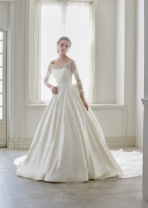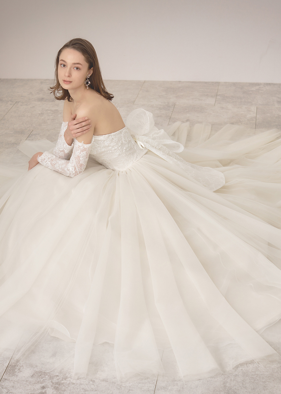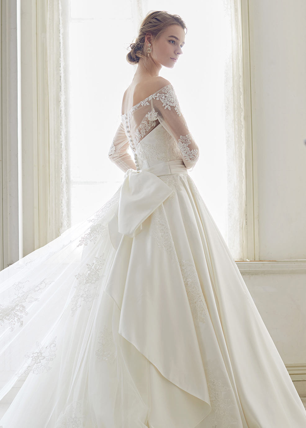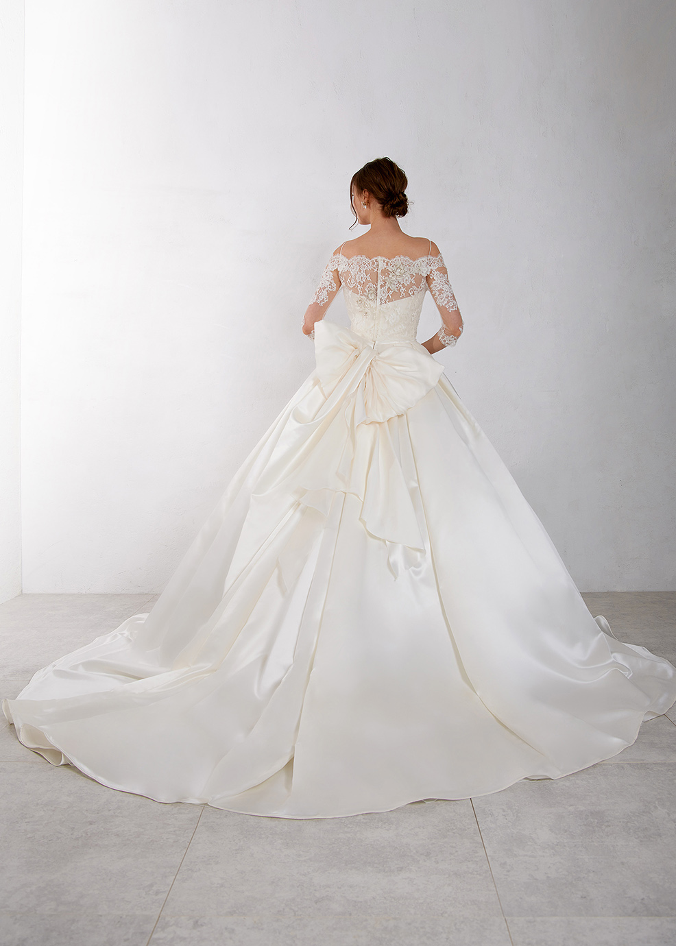 中厚のサテン地が柔らかい光沢感と優しい雰囲気を与え、繊細な柄のコードレースが印象的なドレス。長袖のオフショルダーヨークはデコルテラインをより綺麗に見せます。トレーンは取り外し式。2種類のレースがみせる美しいコントラストがポイント。クラシカルさもありつつ立体的なバックリボンでモダンな印象も与えたおしゃれな1着です。
