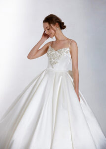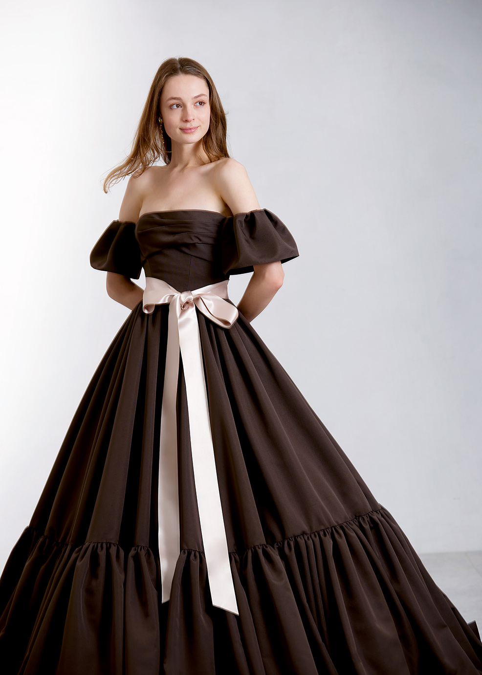 交織ミカドの張り感でスカートをたくしあげて作ったバックスタイルのリボンが特徴的なドレス。身頃はコンパクトさとすっきり感があるデザインに。ボレロには繊細なシャンテリーレースを使用し華奢な印象をプラスしています。ロイヤルウエディングを思わせつような上品さと華やかさを兼ね備えたウェディングドレス。