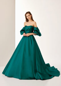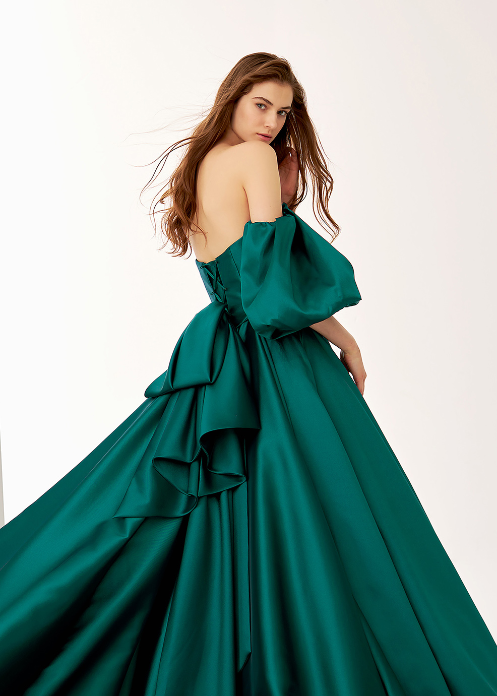 アシメトリーの身頃からつながるように、斜めによじったパフスリーブが印象的なドレス。スカートラインは生地をふんだんに使用して裾に向かい多く広がり、縦に流れるバックリボンは一段と華やか。トレンドのグリーンが美しいカラードレスです。