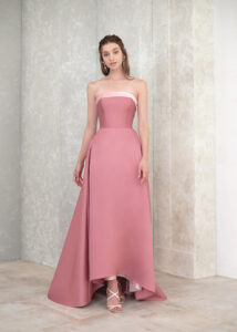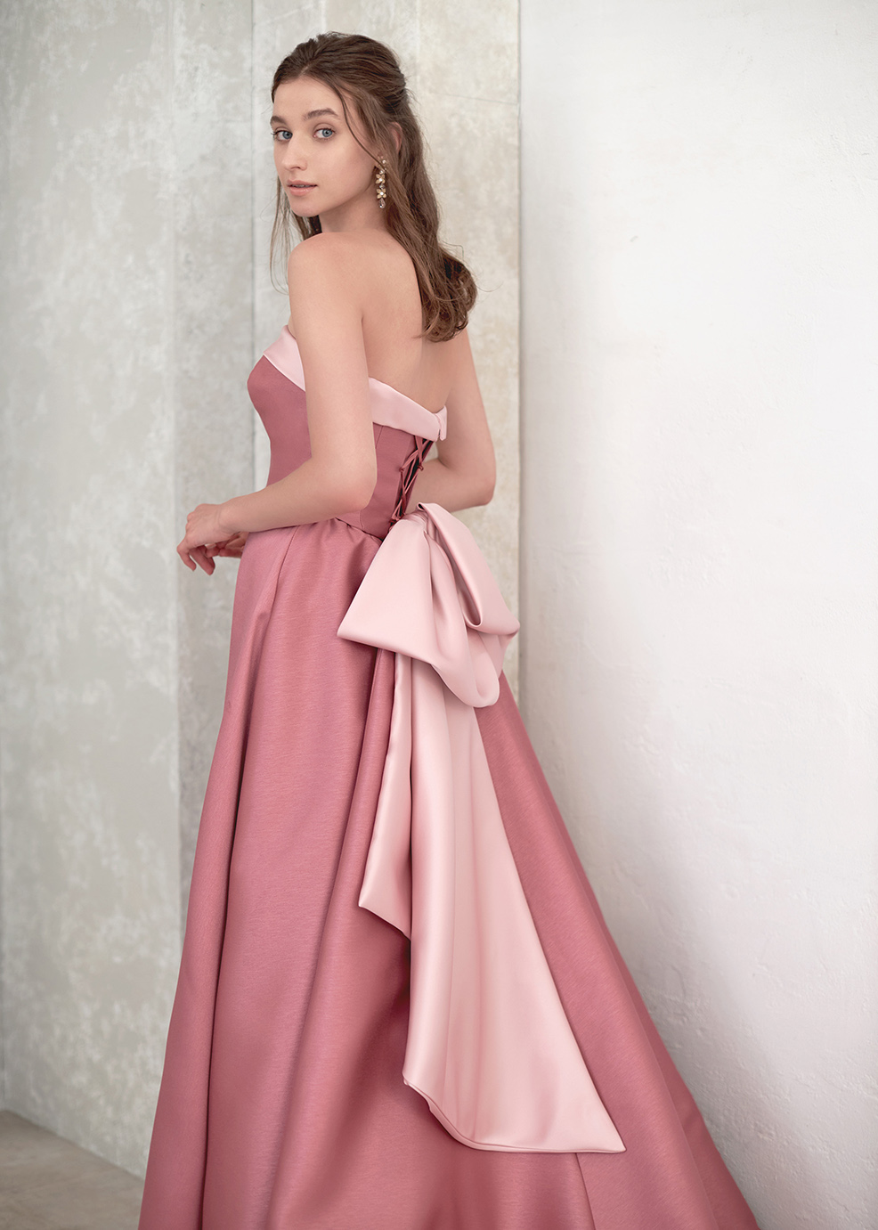 シンプルなデザインでありながらバイカラーの組み合わせと立体的なアシメトリーのバックリボンがおしゃれ。マキシ丈よりも少し短めのスカート丈はサンダルを合わせて足元を楽しめます。リゾート婚にもおすすめのピンクドレスです。
