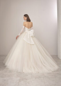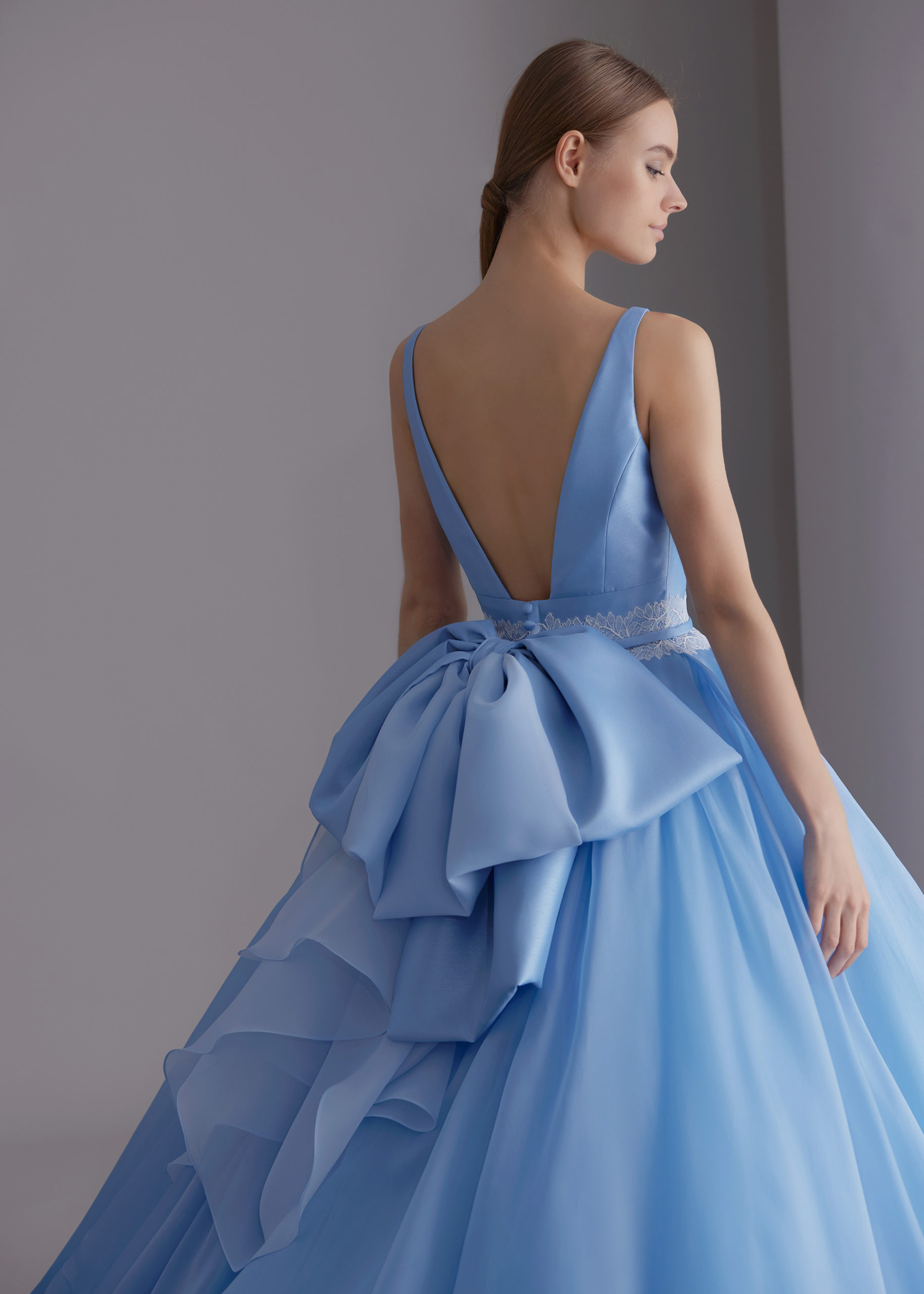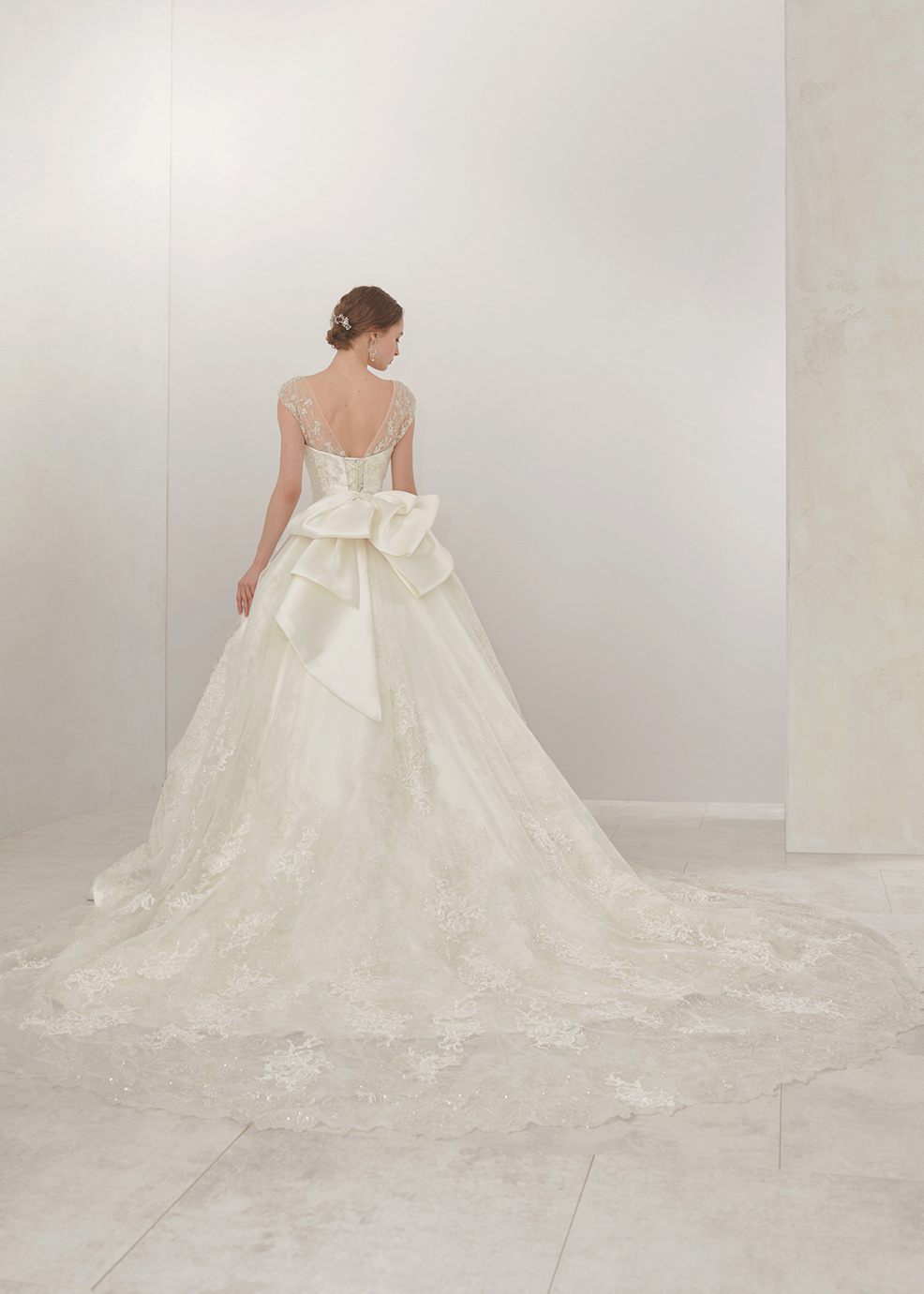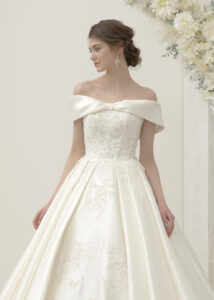 光沢のあるサテンとシルクオーガンジーをミックスした構築的なバックリボンが印象的なデザイン。都会的でシンプルなデザインにオフショルダーのレースボレロを羽織る事で、愛らしい雰囲気で誰にでも着こなせるようになっています。Vカットを施したネックラインはデコルテを美しく見せ、体型をカバーしたい花嫁様にもおすすめ。