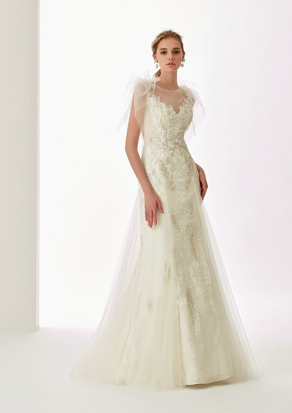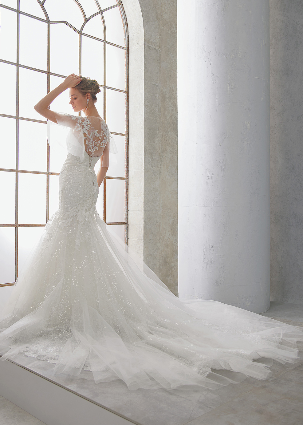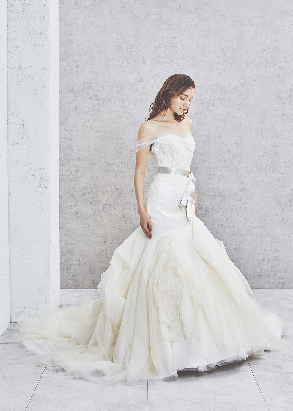 チュールの、もやがかかったようなショルダーやスカートがポイントのソフトマーメイドラインドレス。細やかなビーディングが施されたレースモチーフ、グリッター、スパンコールレースの3種の加工生地を組み合わせて、装飾に立体感があり、マーメイドながらとても贅沢な1着。