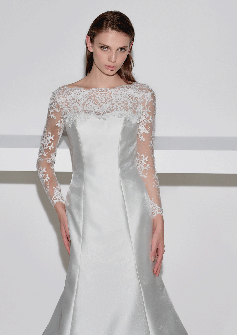 シンプルで程よい抜け感のあるラインが特徴のソフトマーメイドライン。長袖のヨークをオンすることで、印象の違う雰囲気を味わえます。洗練された都会的なこのドレスは大人花嫁様にぴったりのウェディングドレスです。