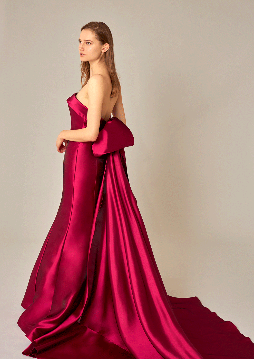 パッと目を引く赤のソフトマーメイドラインのカラードレスです。フロントはすっきりとシンプル、バックは立体的なリボンが流れて大人っぽい華やかさを演出します。どこかインポートっぽい雰囲気もある、モードな1着です。