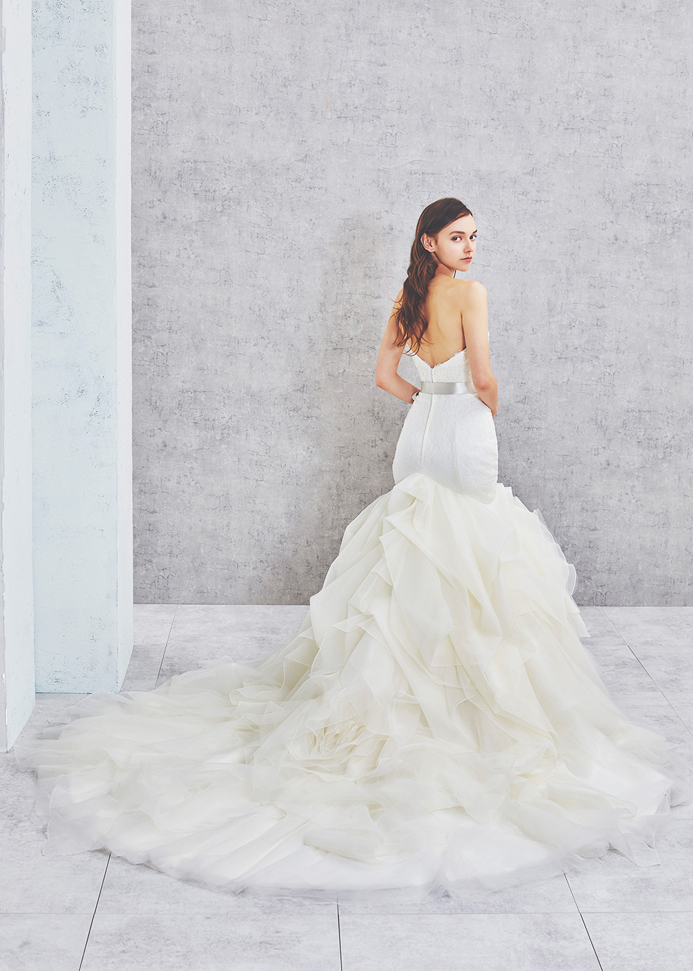 ラグジュアリー感あふれるシンプルかつエッジの効いたおしゃれなマーメイドラインドレス。バックフリルも構築的でエレガントな印象、マーメイドラインをかっこよく着こなしたい、インポート志向の花嫁様におすすめです。