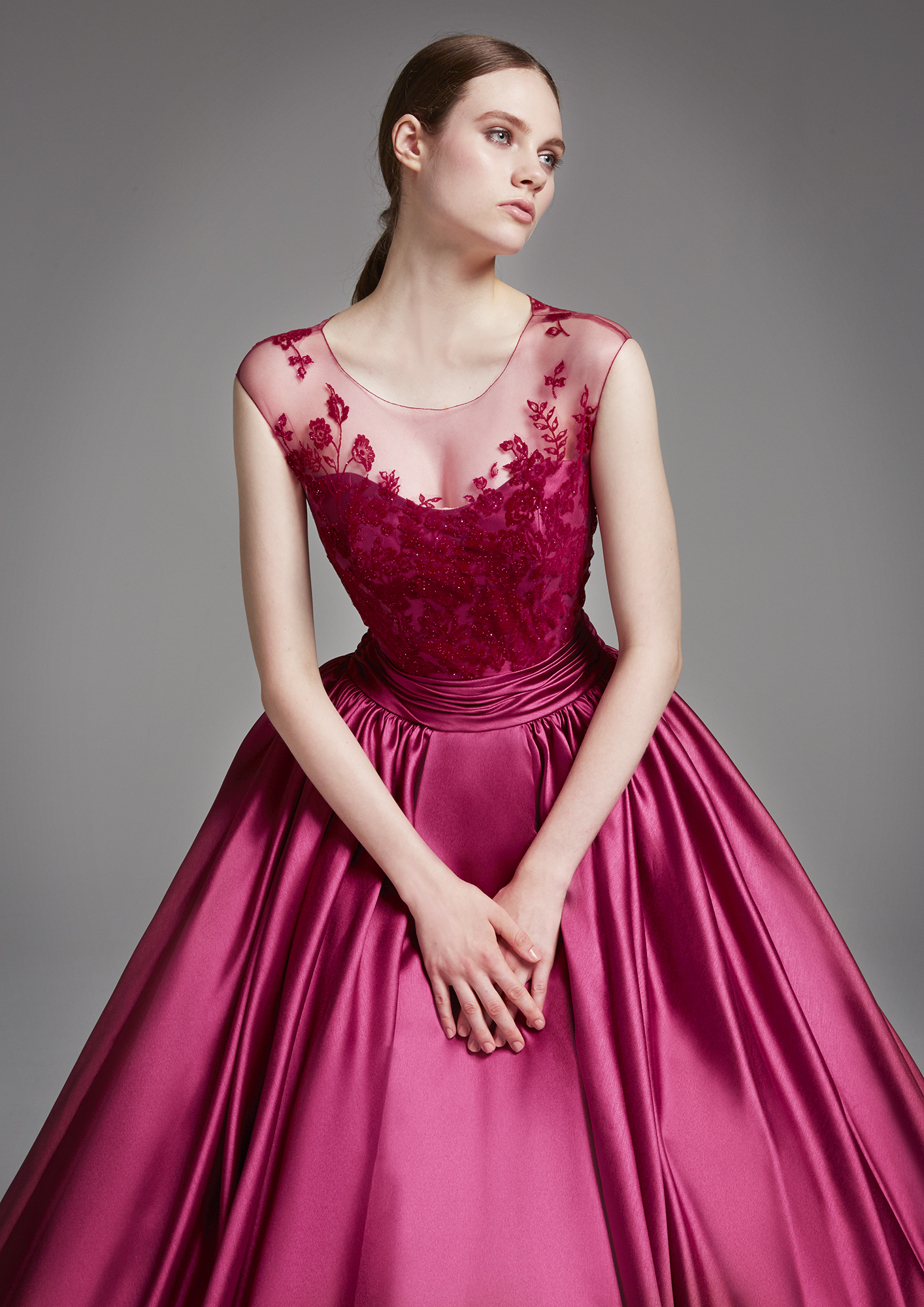 『深味と透明感のあるブライトカラー』にこだわってオリジナルで染めたチュールドレス。胸元は繊細なビーズリバーレースをふんだんに使用して可愛らしく、リッチな大人のプリンセスになれる1着。