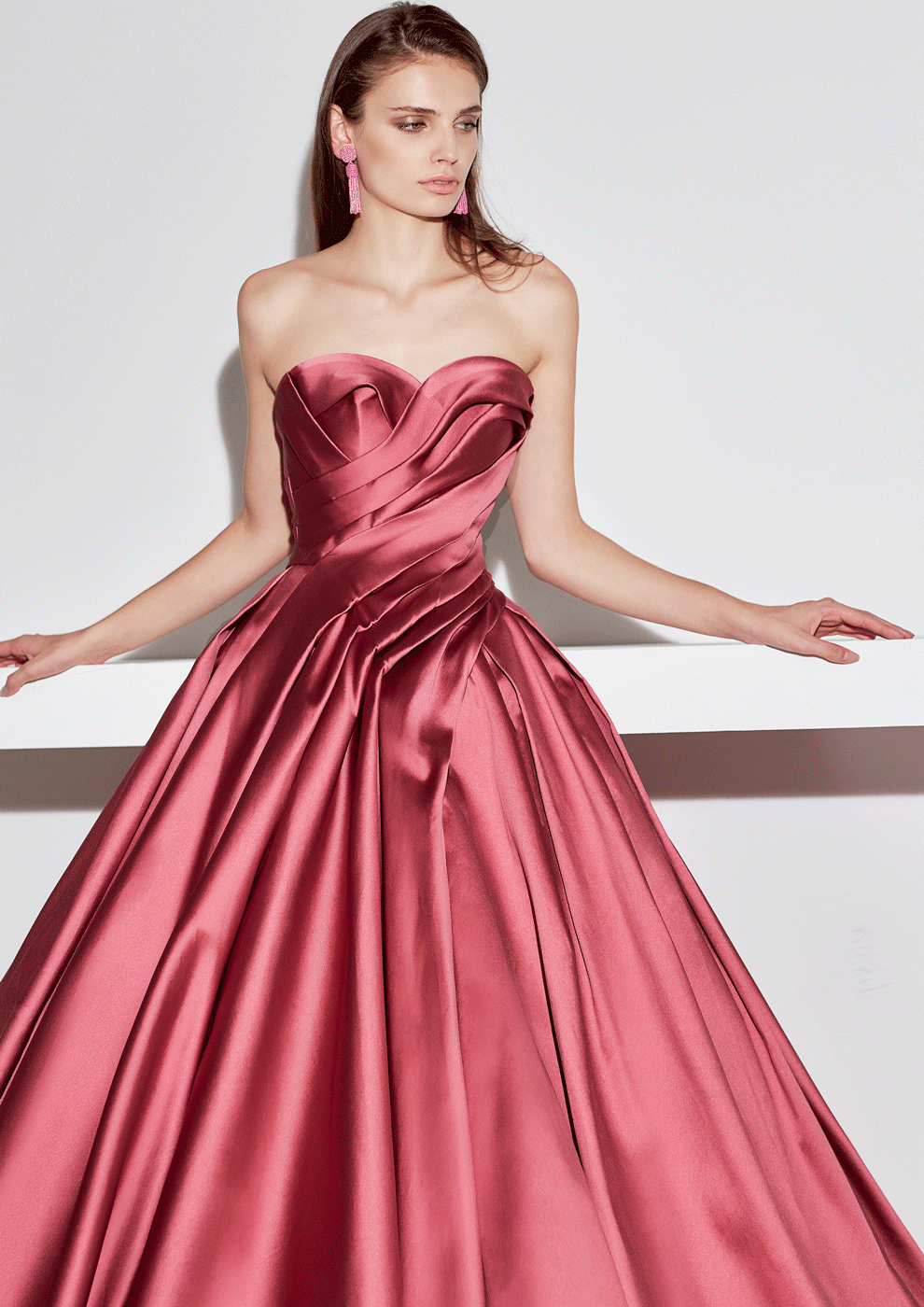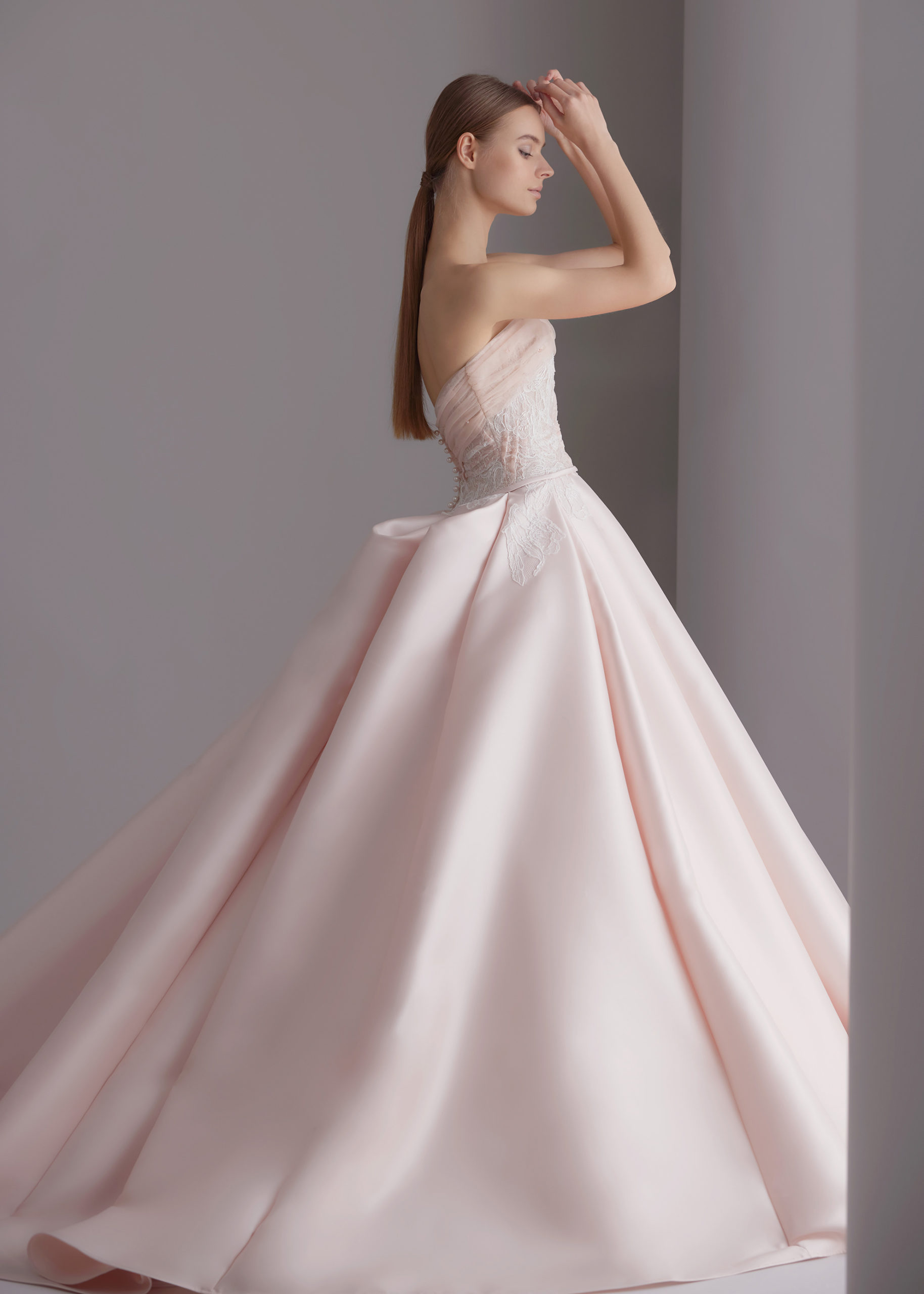 淡く優しいライトピンクが大人な印象でリバーレースとオーガンジーにプリーツ加工を施して格子柄を表現した身頃が特徴的なドレス。チュールドレープを合わせる事によりコンパクトで柔らかな印象に仕上げています。中厚のブライトミカドをたっぷりと使用。後ろスカートは構築的にボリュームを出してシンプルで存在感を演出します。