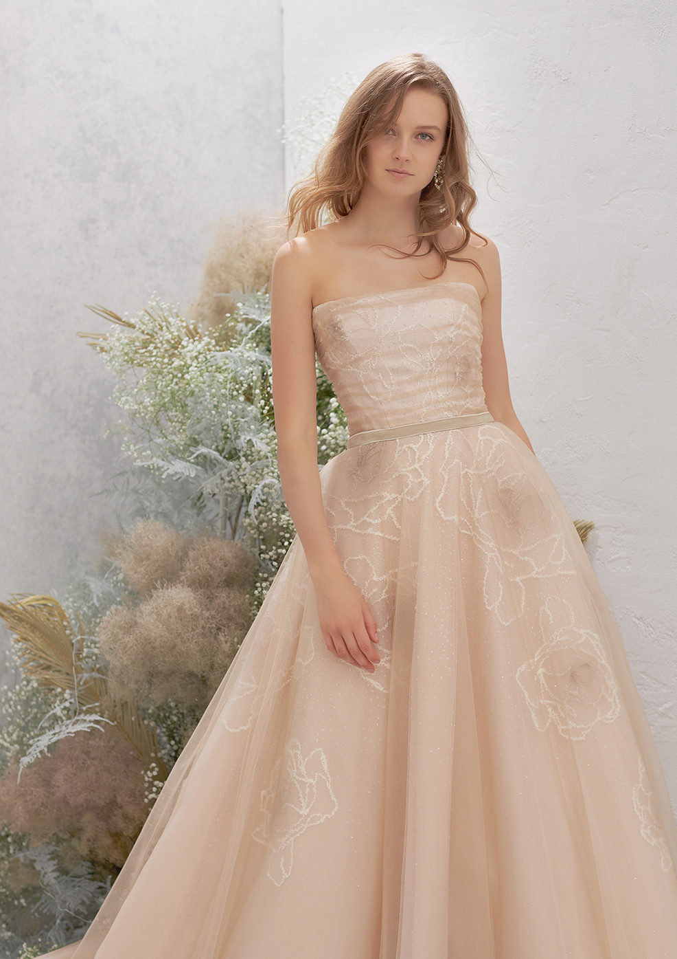 大人のニュアンスカラーで仕上げたピンクベージュのドレス。シックな色合いにグリッターの輝きを添え、シャクヤクをイメージしたコード刺繍の縁取りに吹き付け加工で色付けをしたオリジナルモチーフが特徴です。縁取りのコード刺繍が程よい存在感と抜け感を作り出し、ふんわりとお花が浮かび上がるような印象を残します。