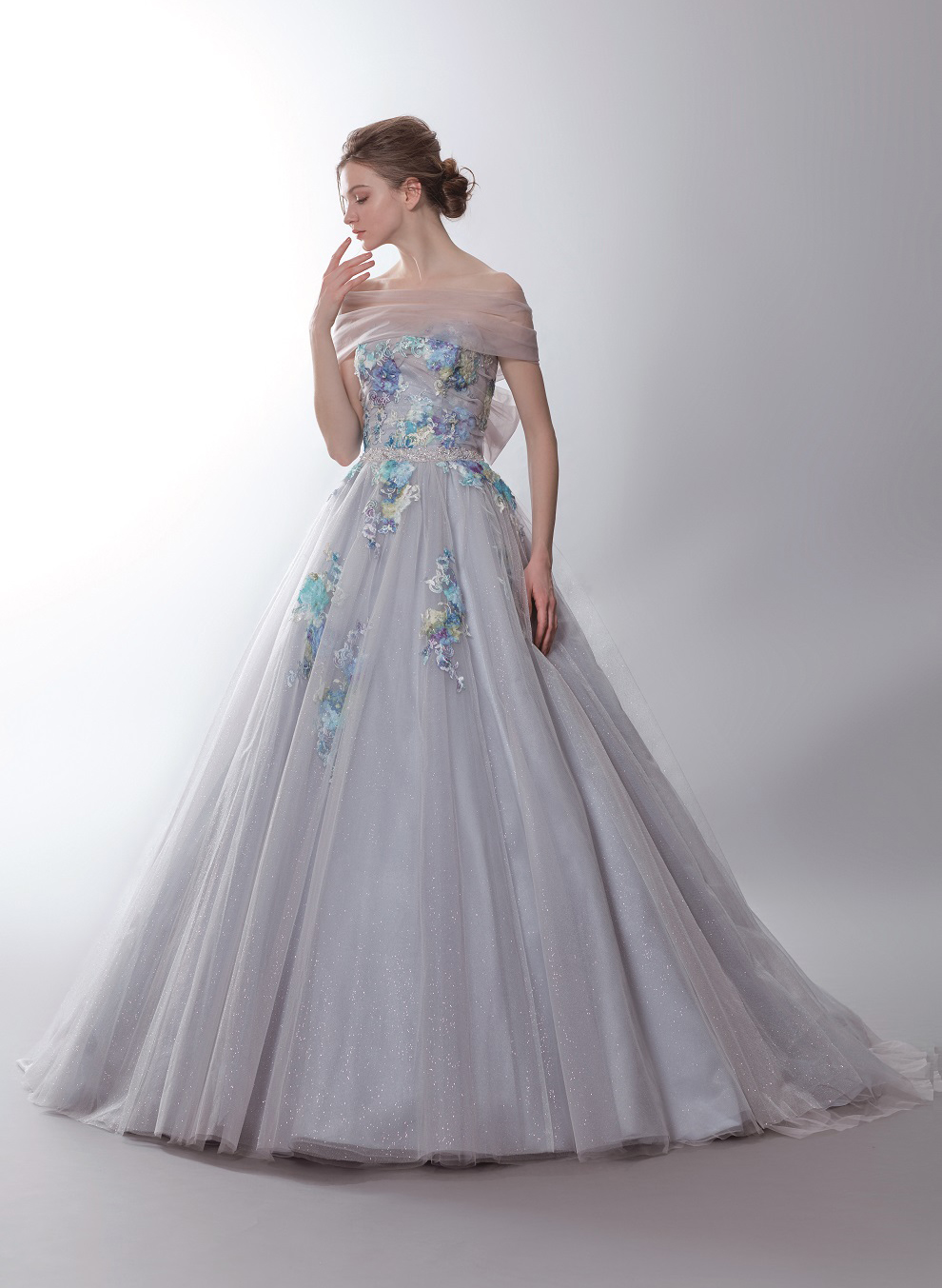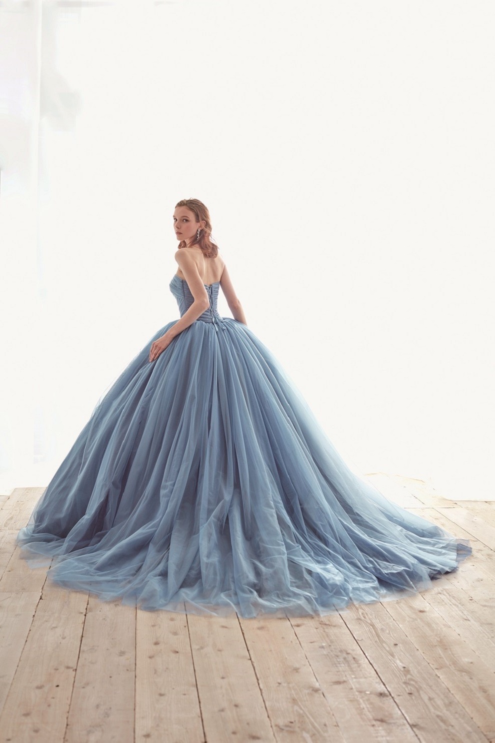 チュールをふんだんに使用し、大きく広がるプリンセスラインが美しいドレス。ブルーグレーの色の表現にこだわり、グレー、ネイビー、ライトブルーと様々な色のチュールを重ね合わせたことによって単色では表すことのできない奥行きのあるニュアンスカラーが印象的な1着。