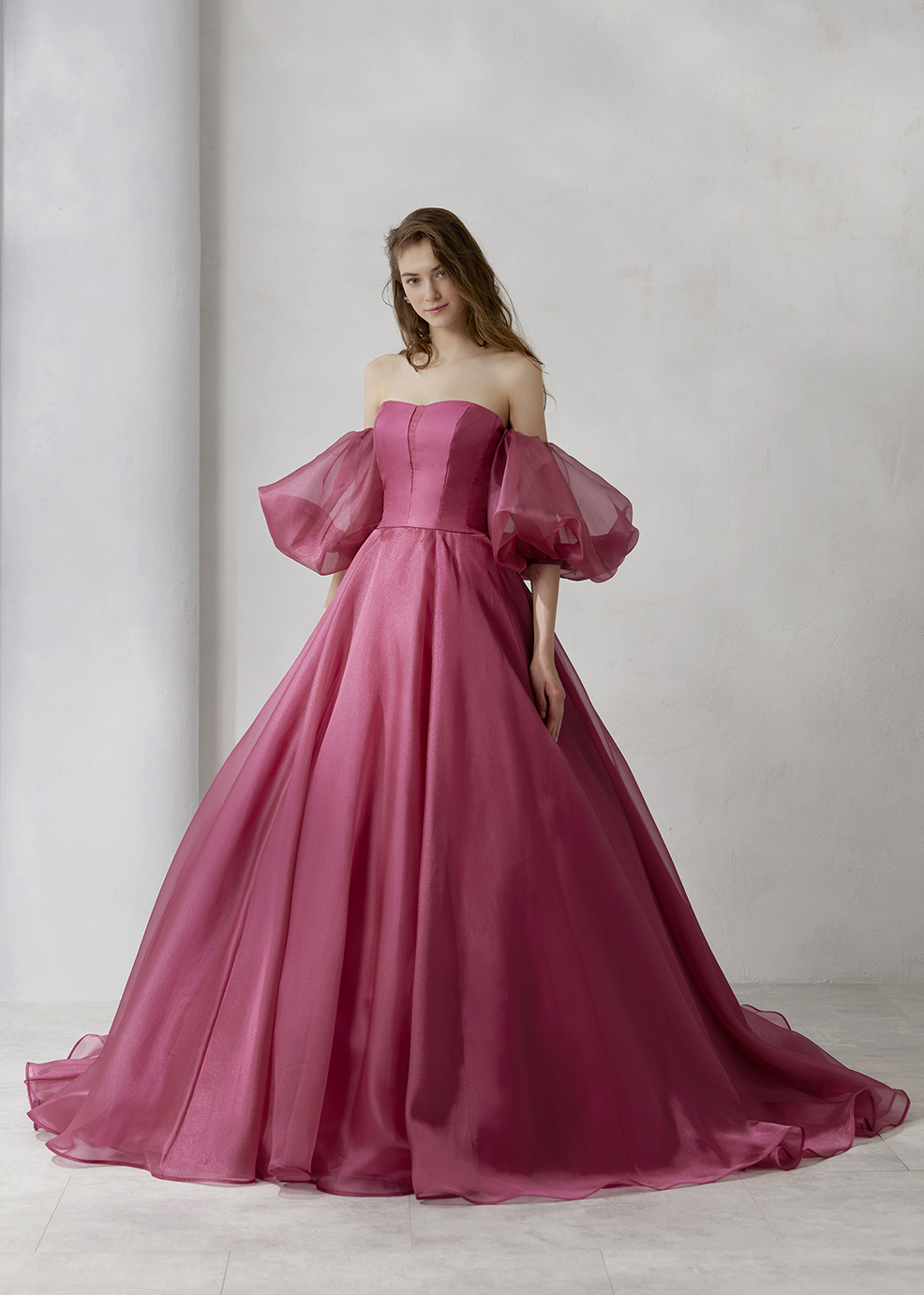 光沢感のあるブライトメッシュをたっぷり使用した華やかなピンクが眩しいAラインドレス。胸元とお袖にフリルをオンすると可愛さ倍増。またパフスリーブにも変更でき身頃でアレンジを楽しめます。