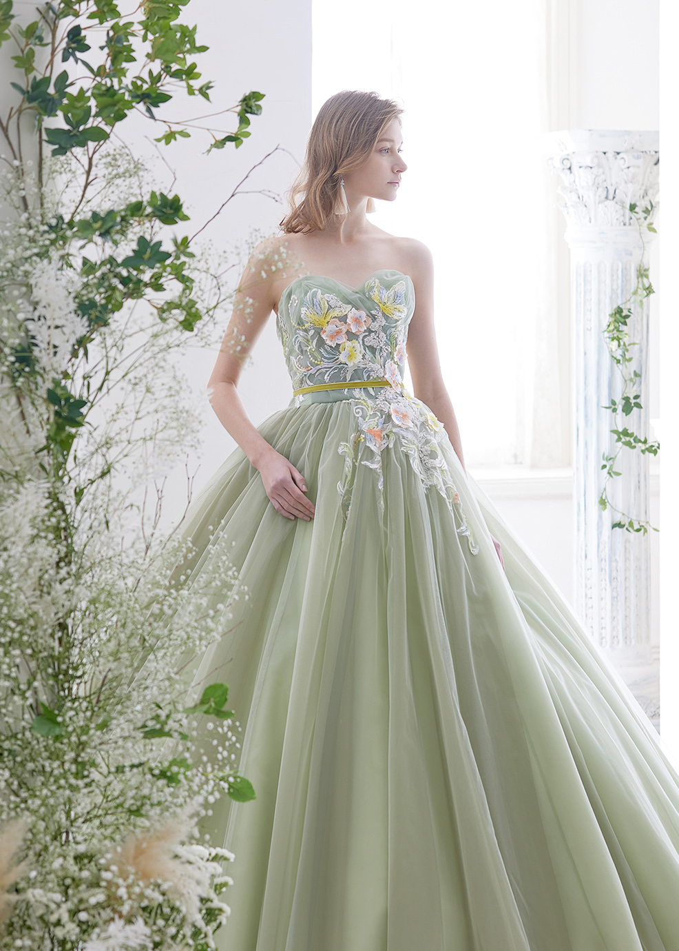 【第6位】グラスグリーンが爽やかなチュールのプリンセスラインドレス