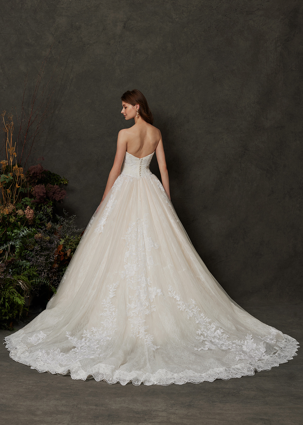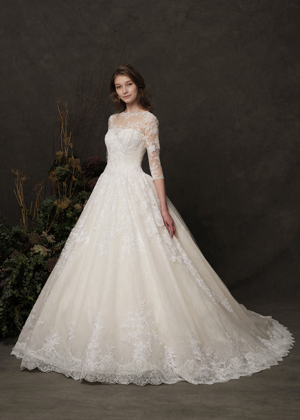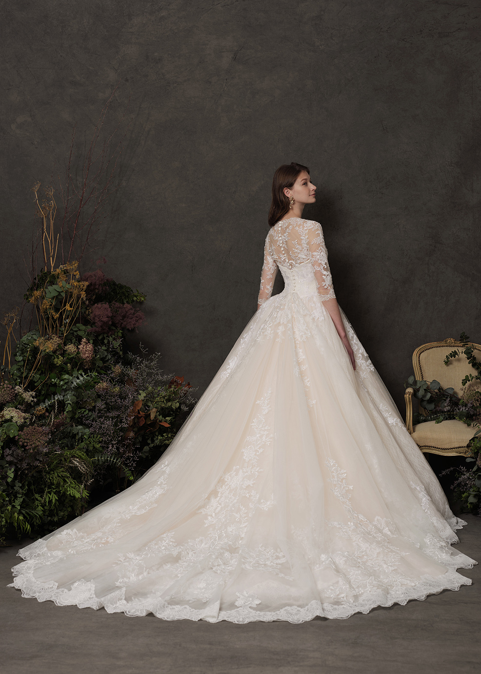 繊細なレース使いでクラシカルな王道スタイルのドレス。レース柄の配置を意識したヨークが特徴。また、取外しのトレーンは、たくし上げたリボンのような立体的な形で、ウエストラインがより一層細く見える視覚効果があります。