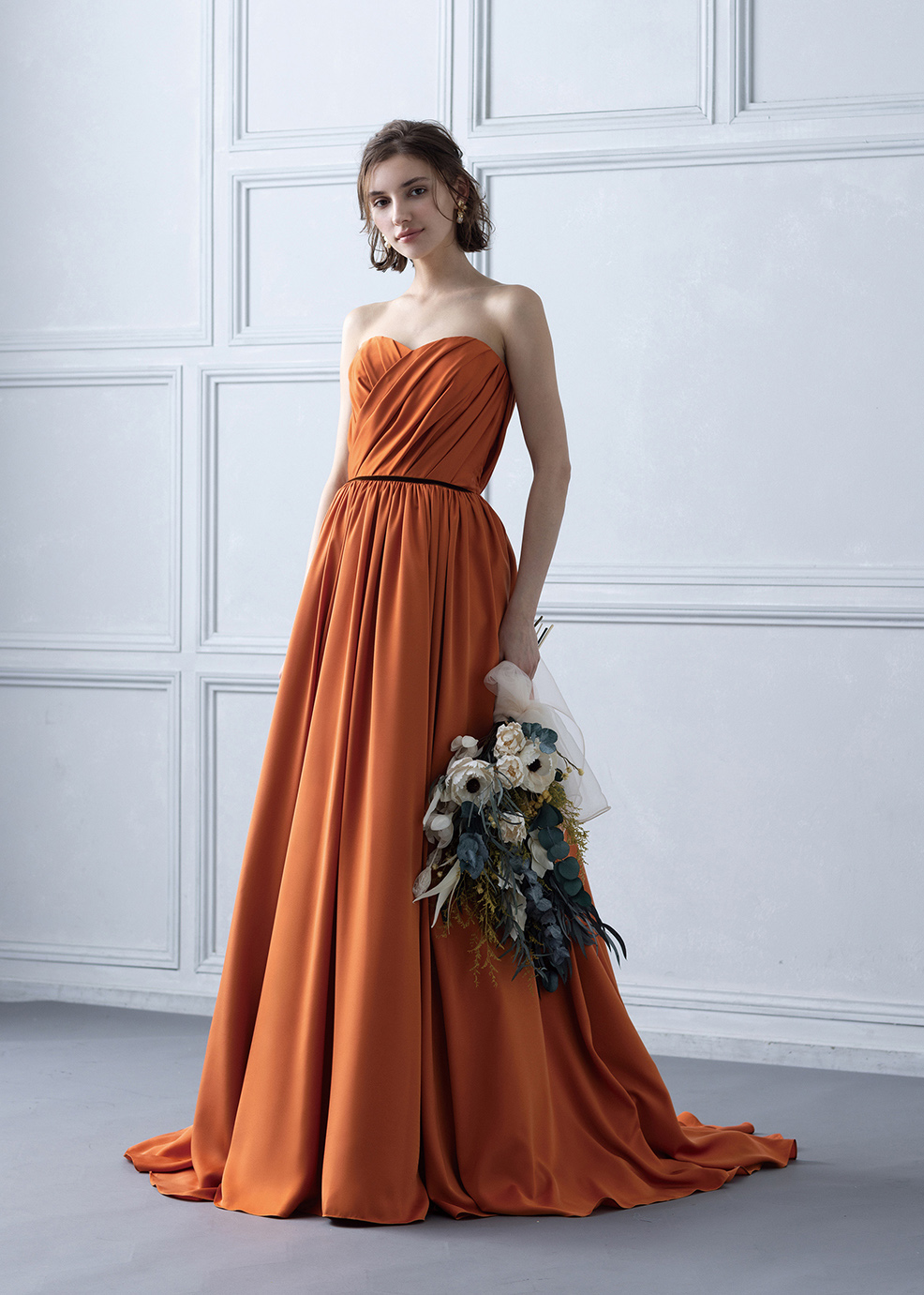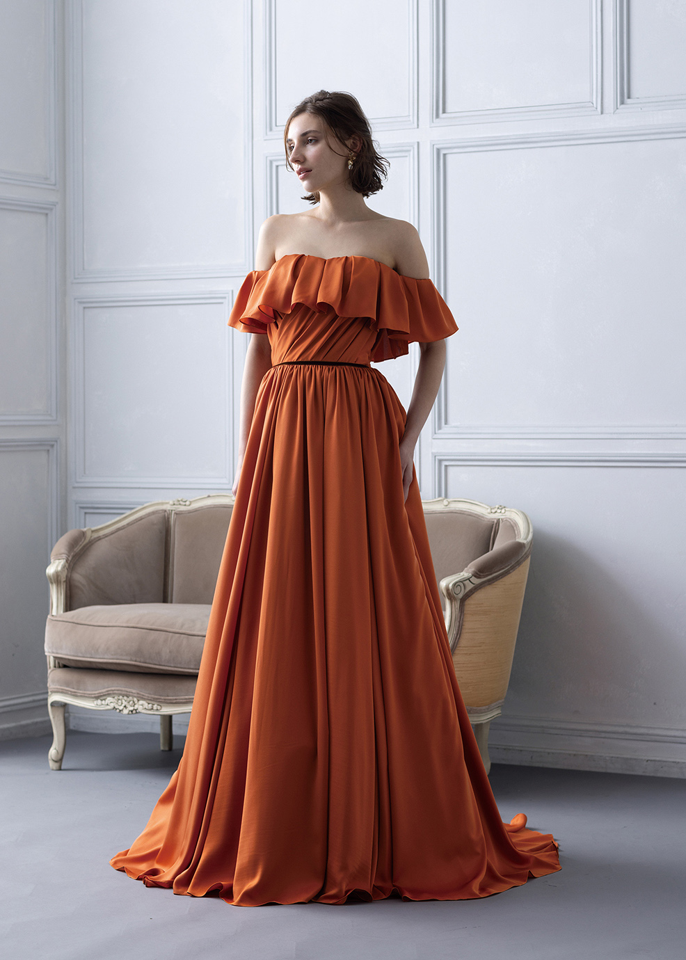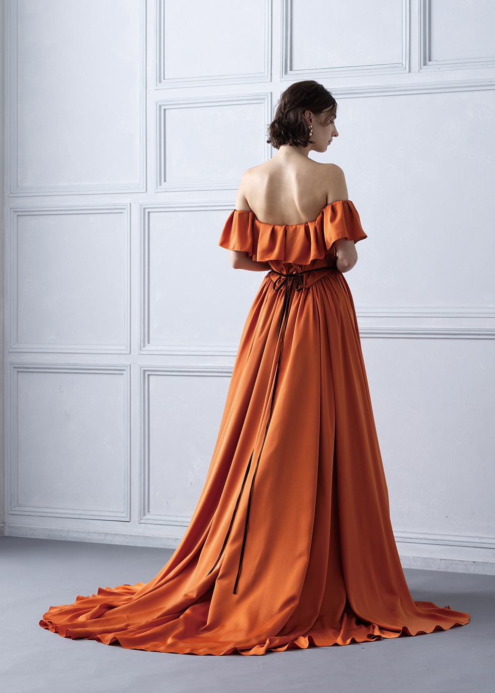 シルデューサテンのしっとりした生地感が女性らしいシルエットを作り出します。スカートの脇ラインの丈を長くすることによりスタイルの良さ、ドレス全体の華やかさを表現しています。身頃のタックもすっきり見せるようにアシメトリーにデザインしました。胸元のフリルは取り外し式です。胸元の印象が変わるのでお好きないイメージで着て頂けます。赤でもオレンジでもブラウンでもないテラコッタカラーは色の奥行きがありワンランク上に花嫁を演出してくれます。