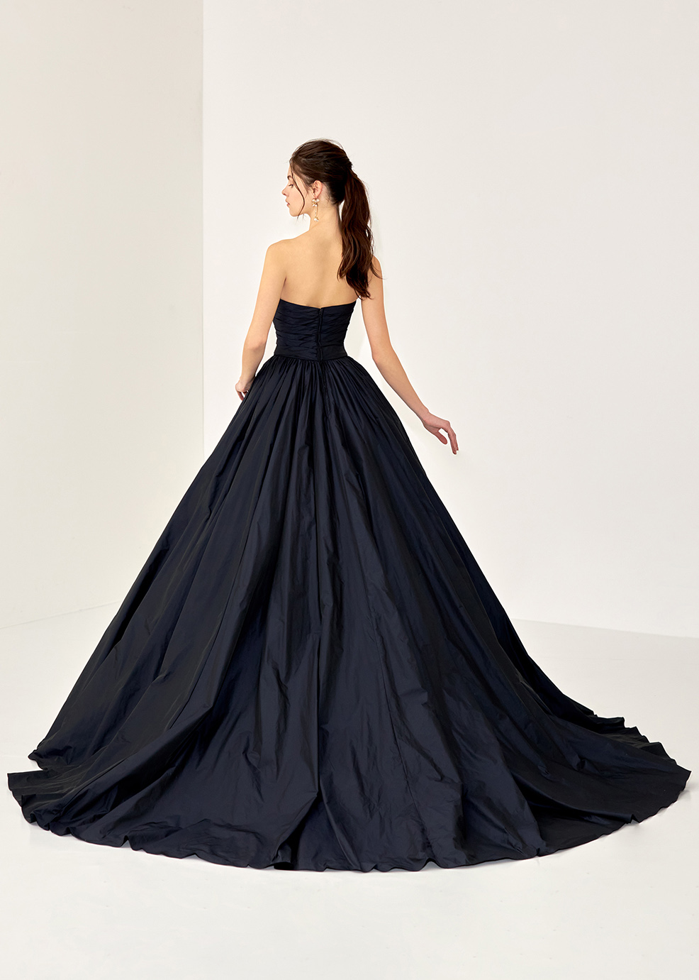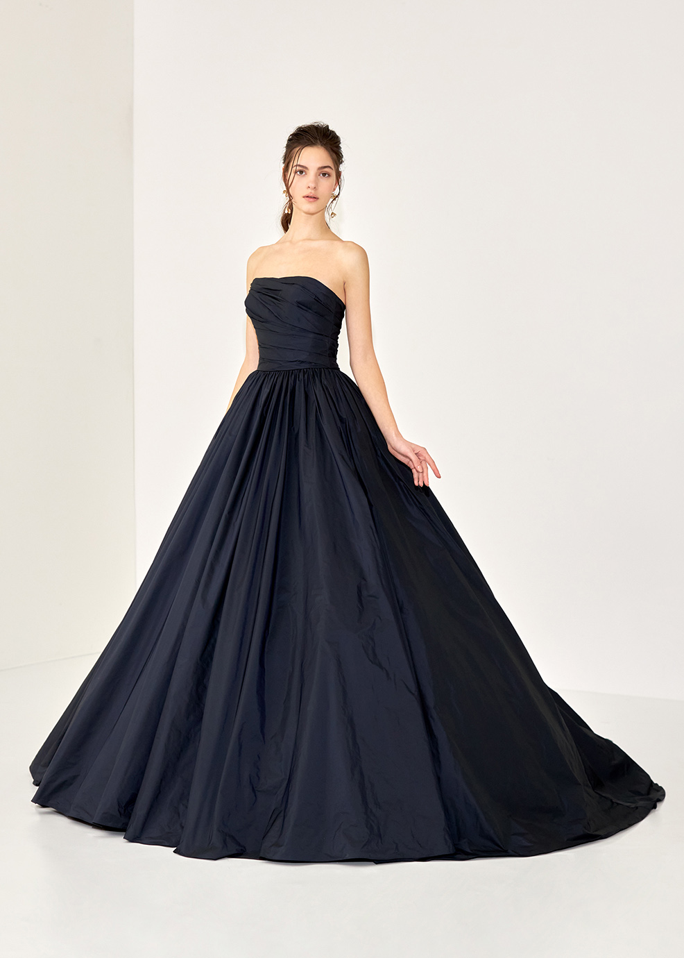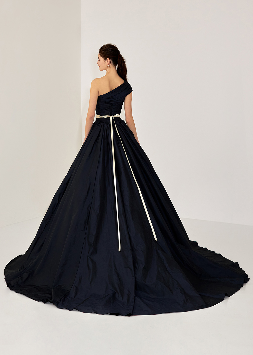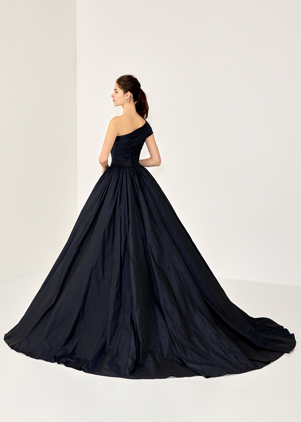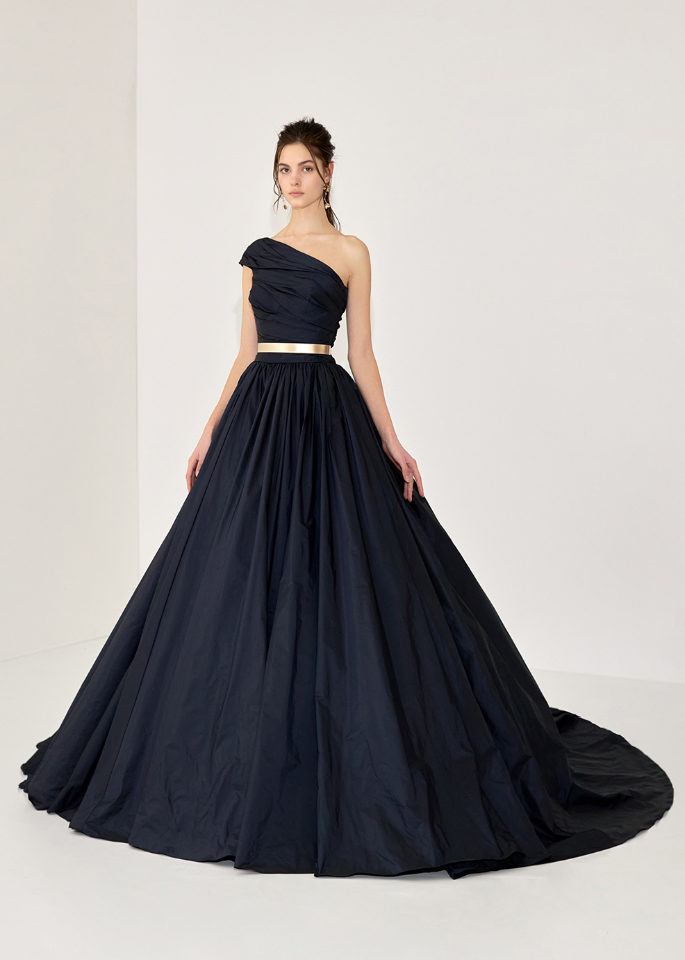 軽やかなタフタをふんだんに使用したモード感溢れたボリュームラインのドレスです。トレンドのワンショルダーをつけていただくと一段とモダンでシャープな印象の花嫁に。また、ゴールドパーツで作られたベルトをつけていただくと全体を引き締め、グレード感もアップします。