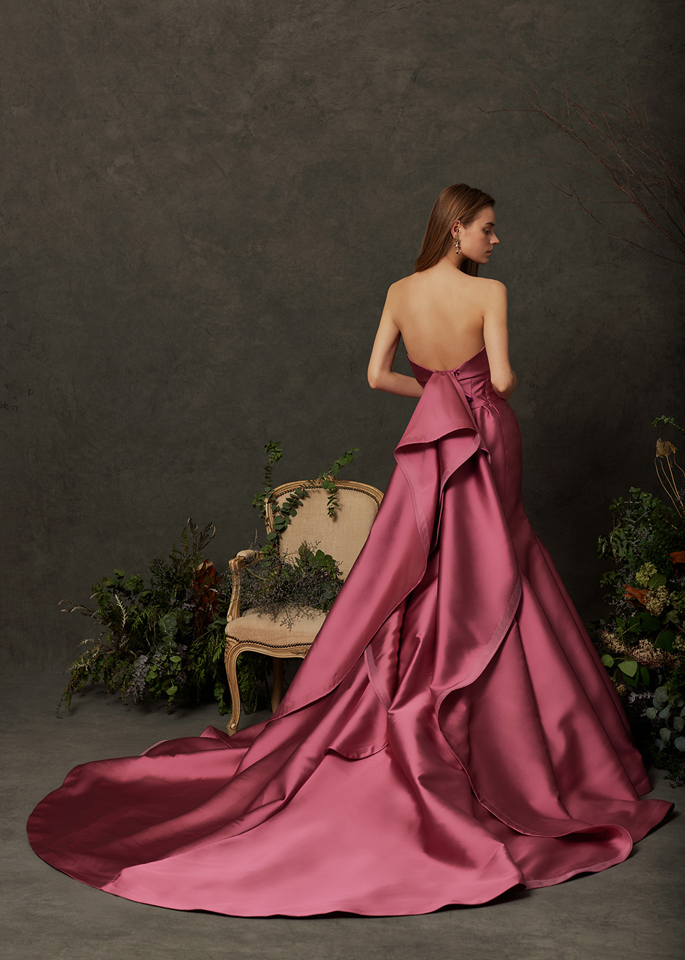 交織ミカドを全体に使用したラグジュアリー感あふれるマーメードドレスです。シルエットにこだわって作成しているのでとてもスタイル良く見えます。バックフリルも構築的なのでバックスタイルもエレガントかつエッジのきいたデザインになります。