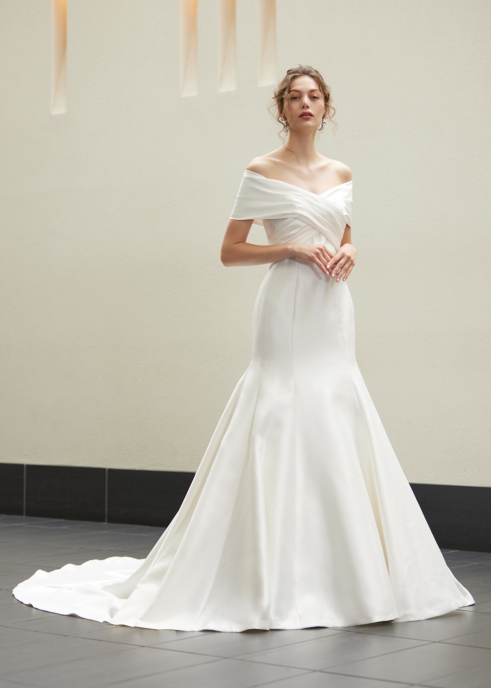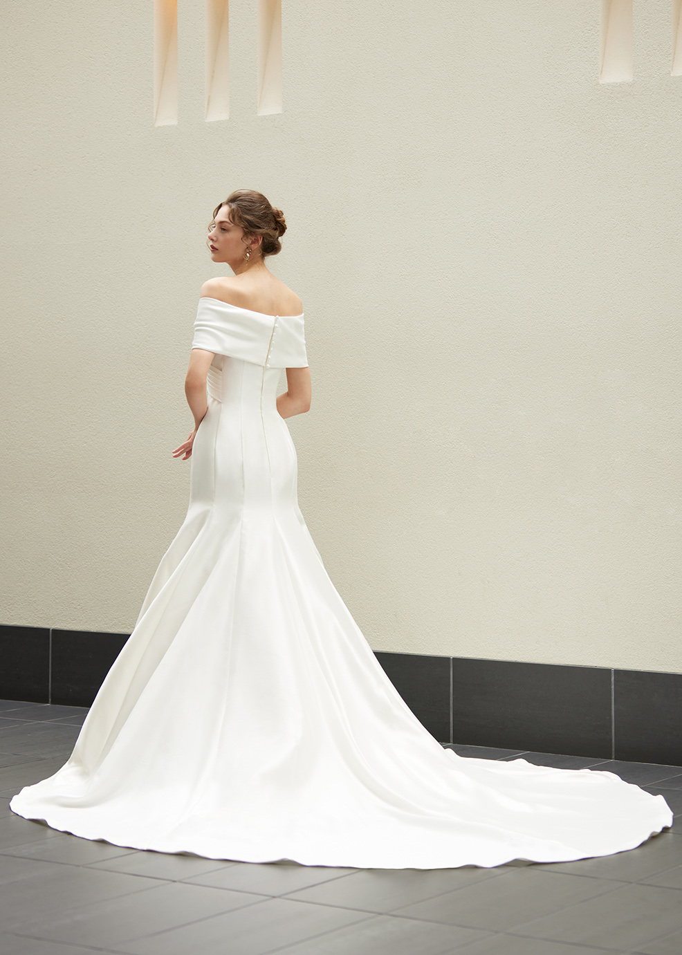 ワイドなロールカラーが特徴的なマーメイドドレス。デコルテラインをVネックですっきりみせ、気になる二の腕もさりげなくカバーしています。光沢感のあるミカド素材はハリ感もあり、ドレスのラインを美しく演出します。シンプルですが気品と存在感のある1着です。