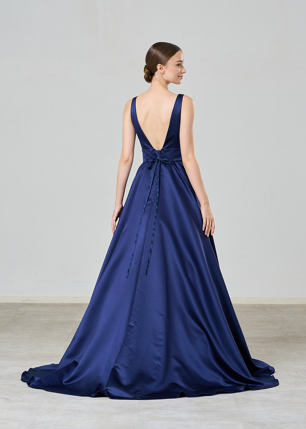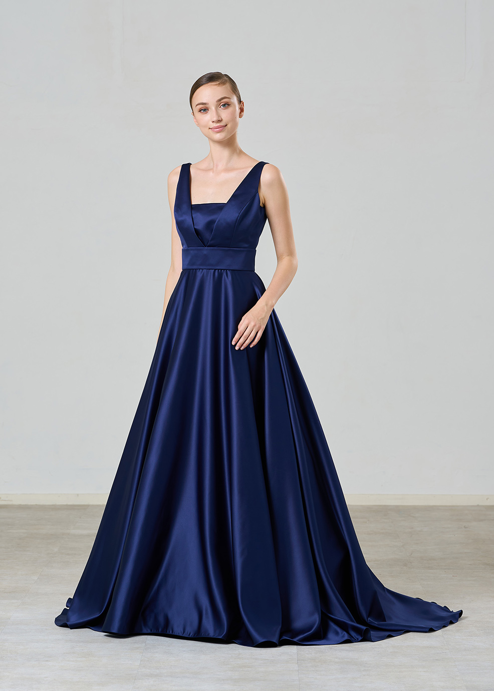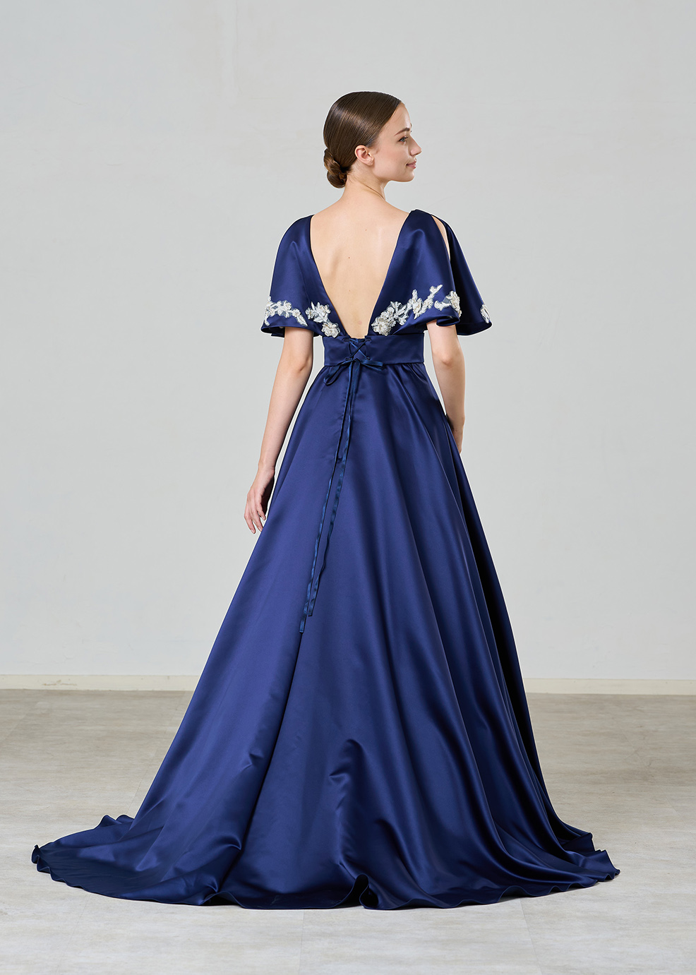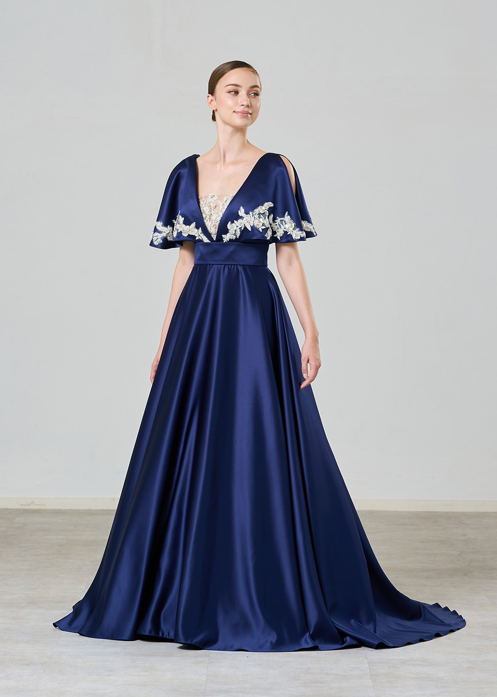 ロイヤル感があるネイビーブルーのサテンにシルバーやクリスタルで作られたインド刺繍が映える高級感感じるボリュームレスのカラードレスです。デザインポイント個性的なケープはフロントを大きなV字でカットしすっきり感と出し。二の腕カバーにもなる抜け感あるデザインです。ケープを外してもらうと。オンショルダーのシンプルなドレスに変わります。