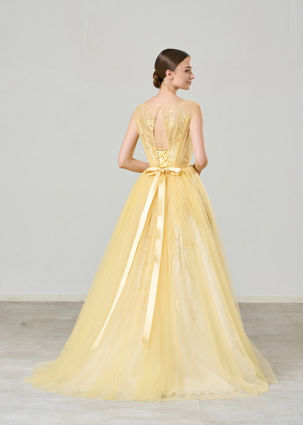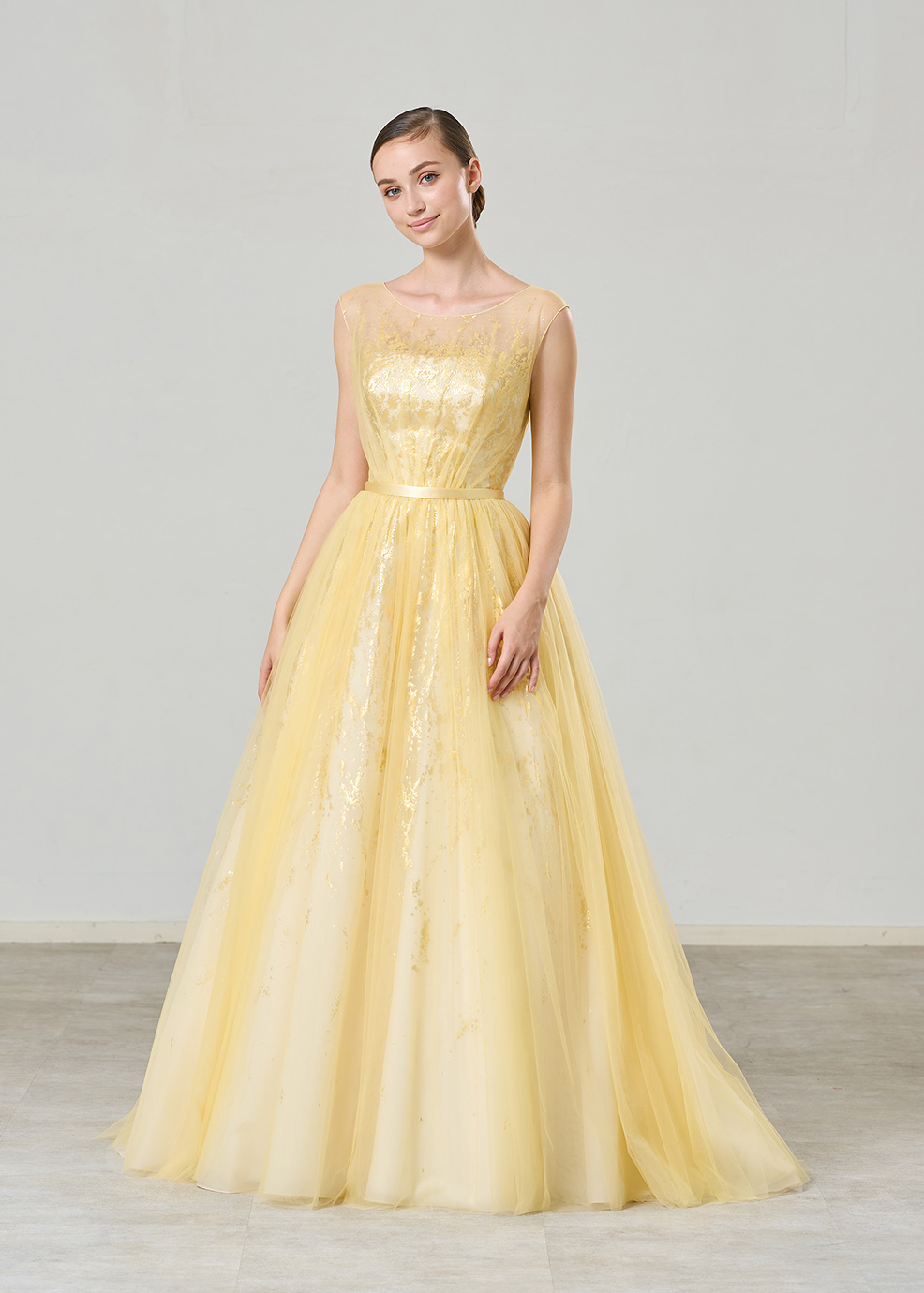 ライトイエローとゴールド箔加工の組み合わせが新鮮な印象の1着です。強い印象のゴールド箔にふんわりギャザーの入ったソフトチュールを重ね着やすい印象に仕上げました。