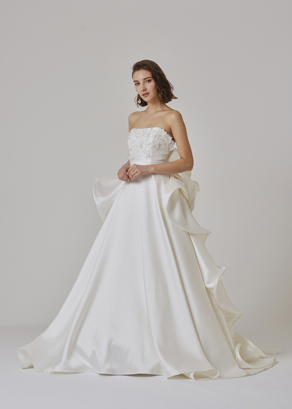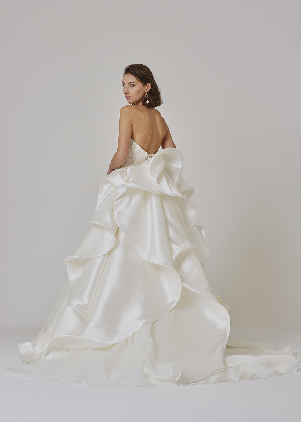 張り感と光沢感あるミカドをふんだんに使用し、立体的につくられたバックフリルの後姿がポイントのドレスです。フリル先にはボーンを施し個性的なスタイルを演出します。身頃はコンパクトに、シルバー糸で作られたレースを使用しています。オーガンで作られた小花モチーフが柔らかい印象をプラスします。