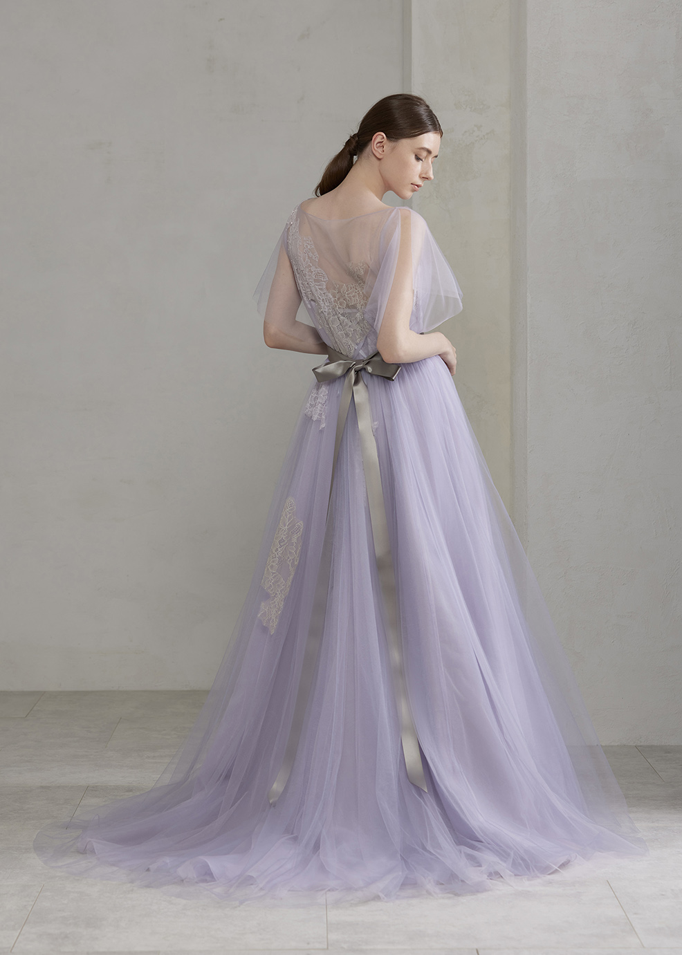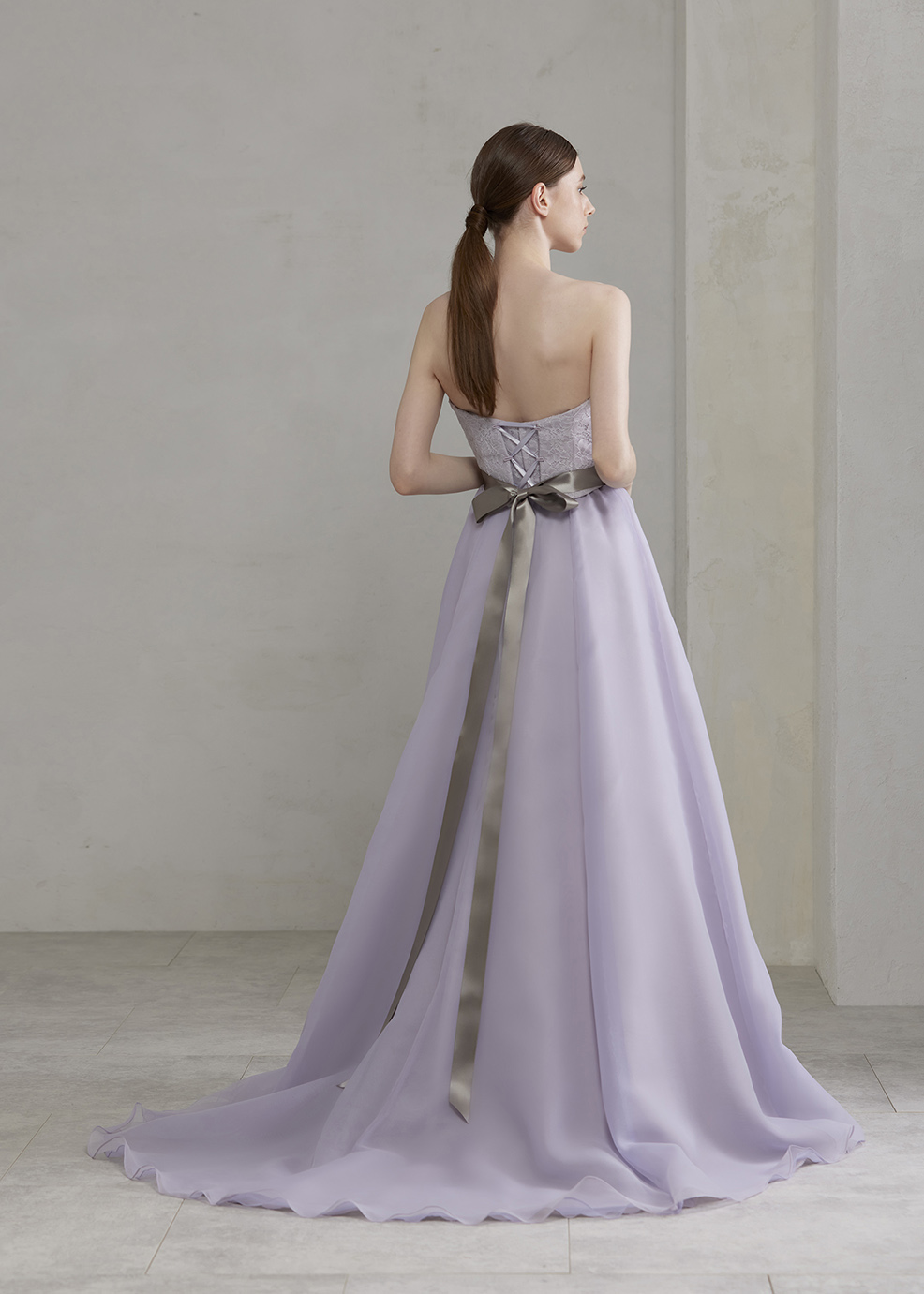 肌に透明感をもたせるアシュラベンダーカラーが清々しい印象のドレスです。 2WAYスタイルのボリュームレスドレスは、柔らかい印象にオーバードレスを外すとすっきりしたソフトAラインのメッシュオーガンジードレスに変わります。オーバードレスの身頃には2種類のスワロスキーを施し上品にきらめきます。