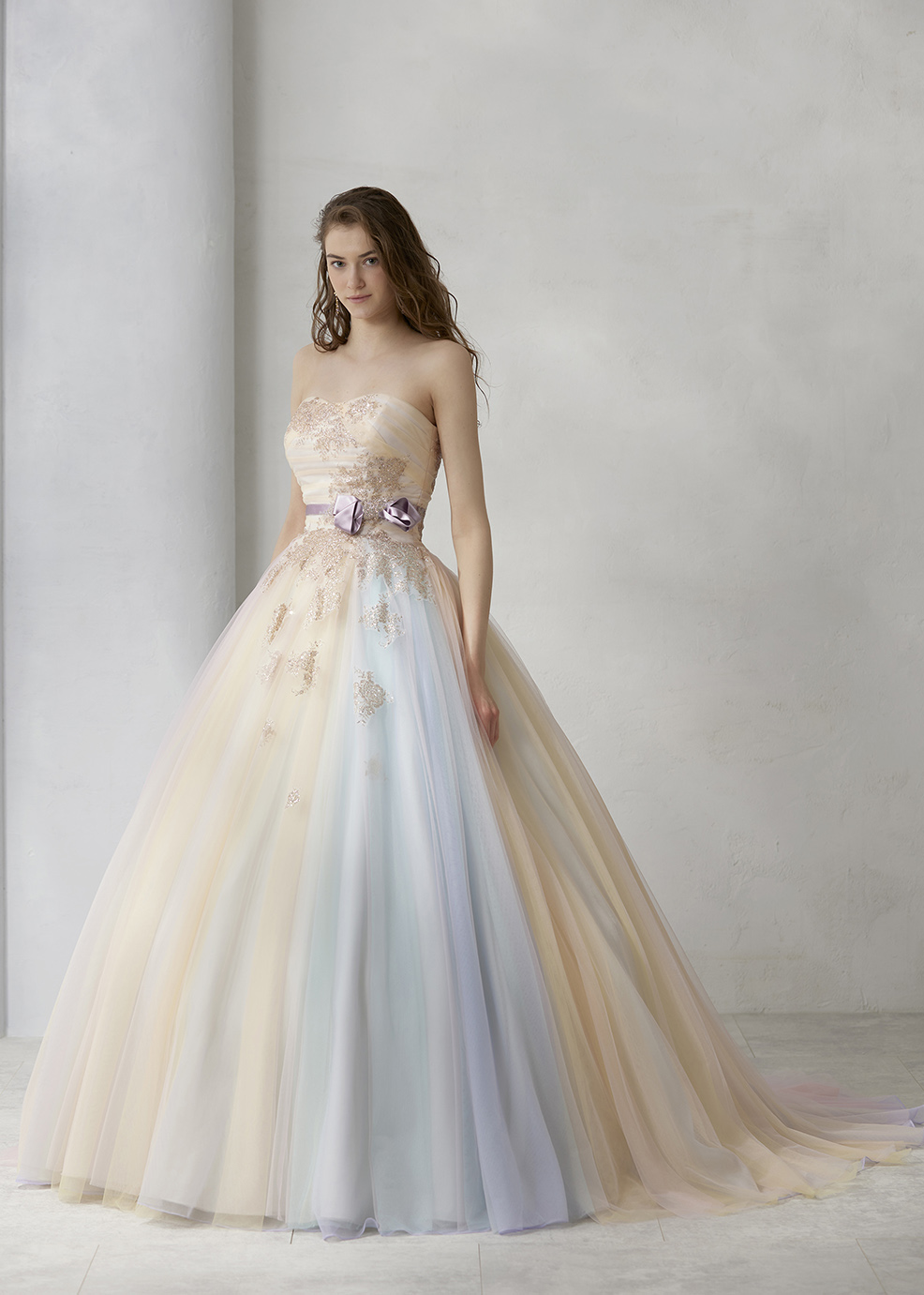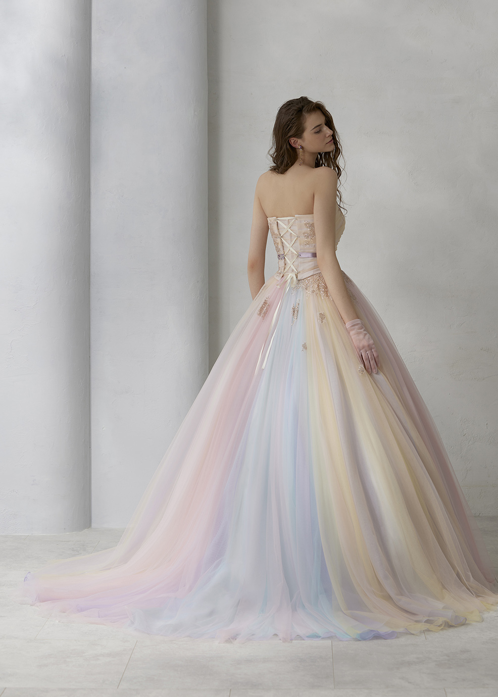 パステル調のブルー、グリーン、イエロー、ピンクのグラデーションが奏でるハーモニーが美しいチュールドレス。身頃から流れるグリッターが輝きをプラスし、お顔周りを華やかにみせ優雅な印象を持たせます。