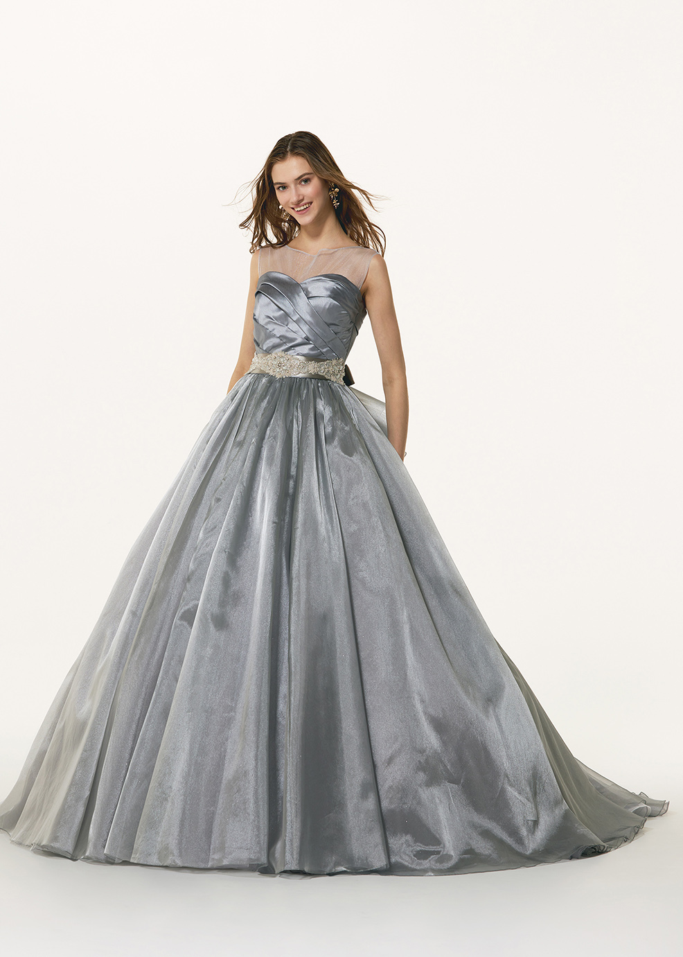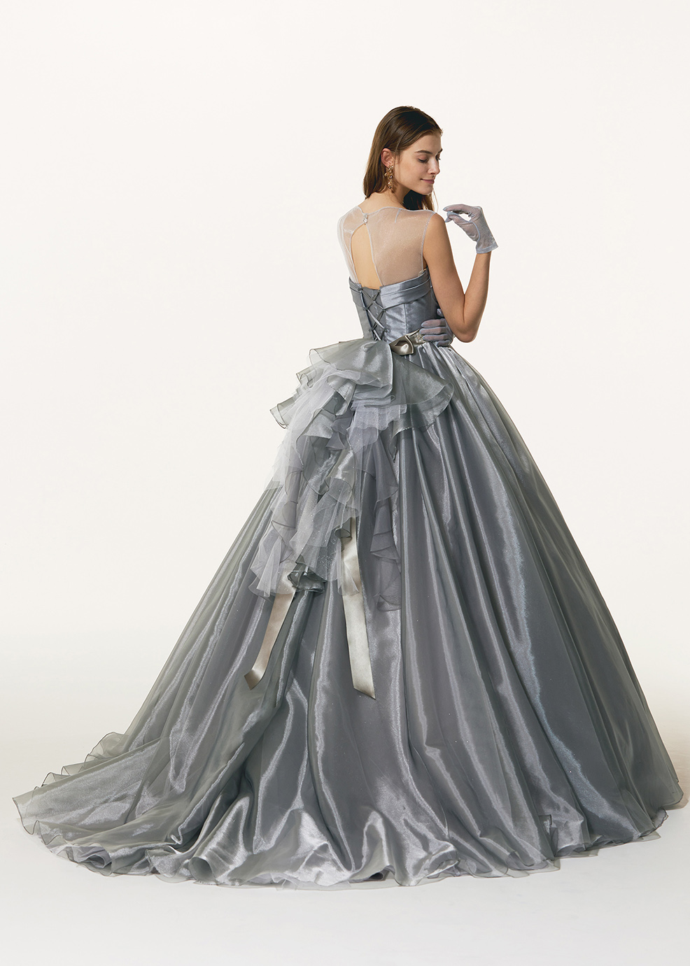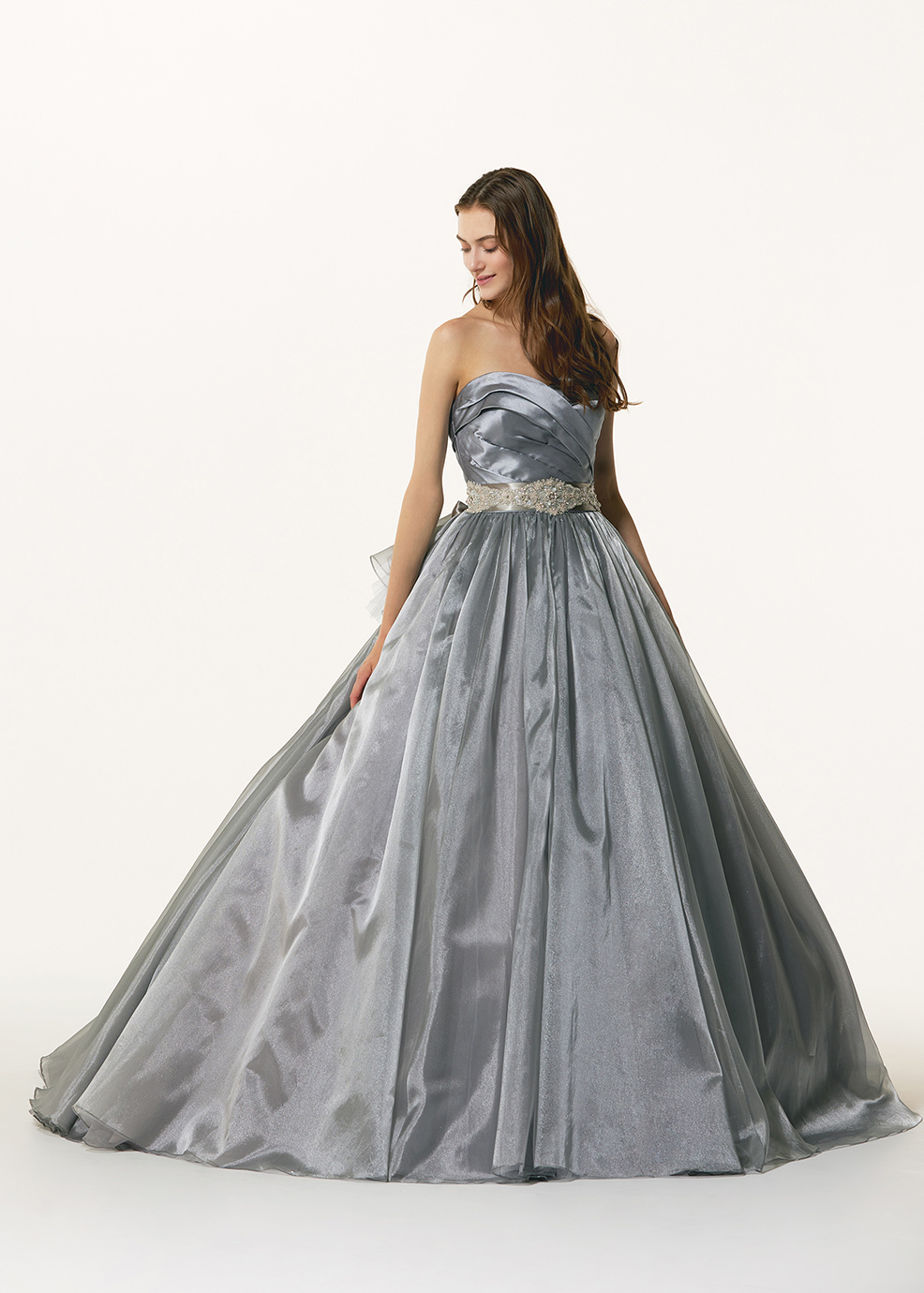 上品な輝きのグリッターチュールと、パールオーガンジーを掛け合わせ、グレーでも暗くならず、光沢感とグリッターの輝きが、明るく華やかな印象のグレーを作り出しました。蹴回したっぷりの大きな広がりのスカートがより身頃をコンパクトに、バランスよく見せてくれます。ウエストマークしたビーズベルトのシルバーがアクセントに。とても着やすく、華やかなデザインので、オシャレカラーのグレーとして挑戦していただきやすいドレスになっています。バックフリル、ウエストベルトは取り外し可能なので、お好みのスタイルに合わせてアレンジして着て頂きたいです。