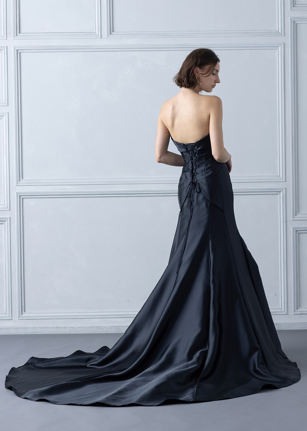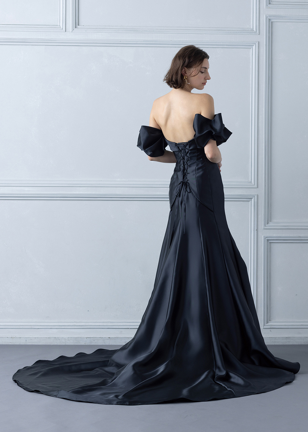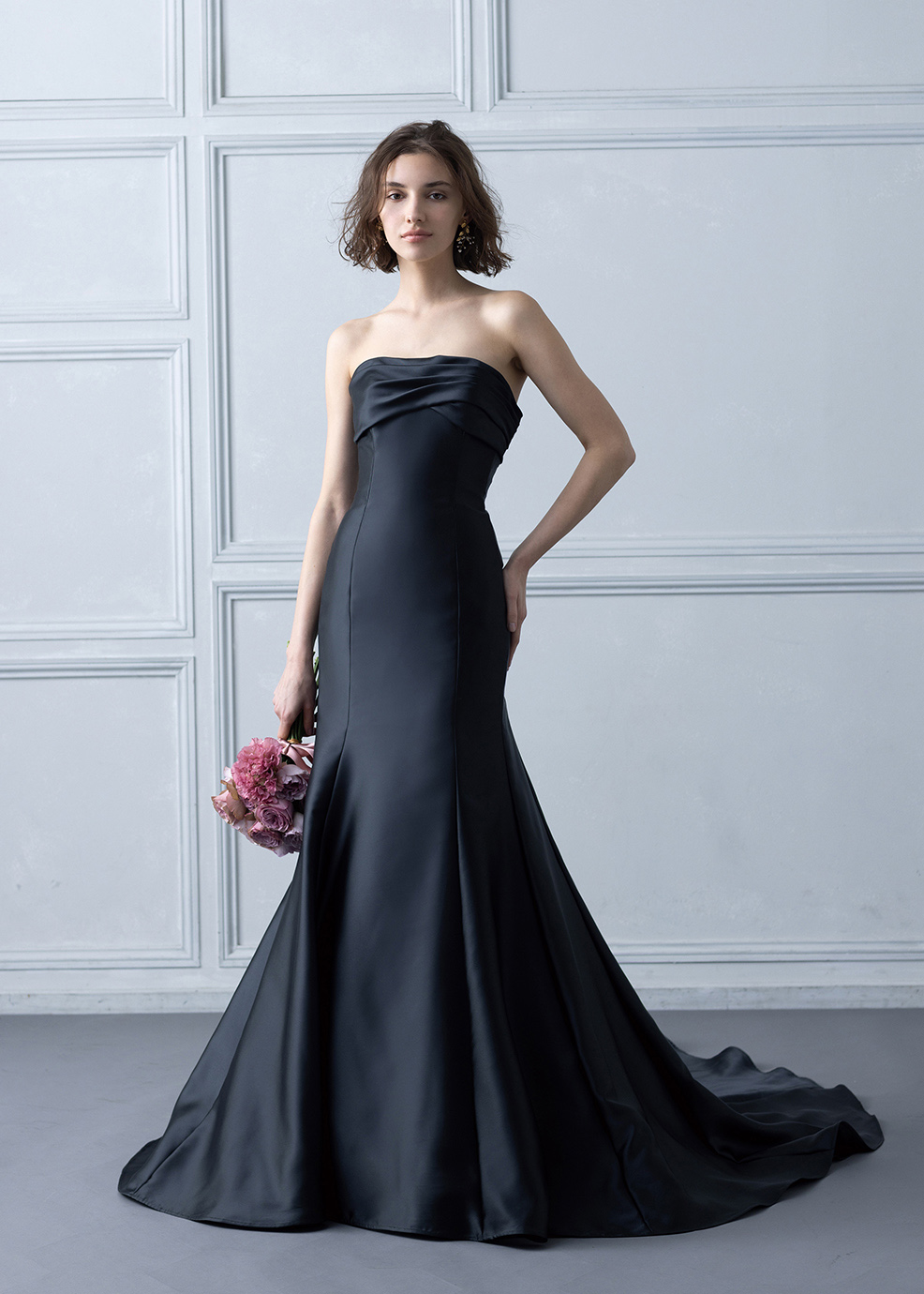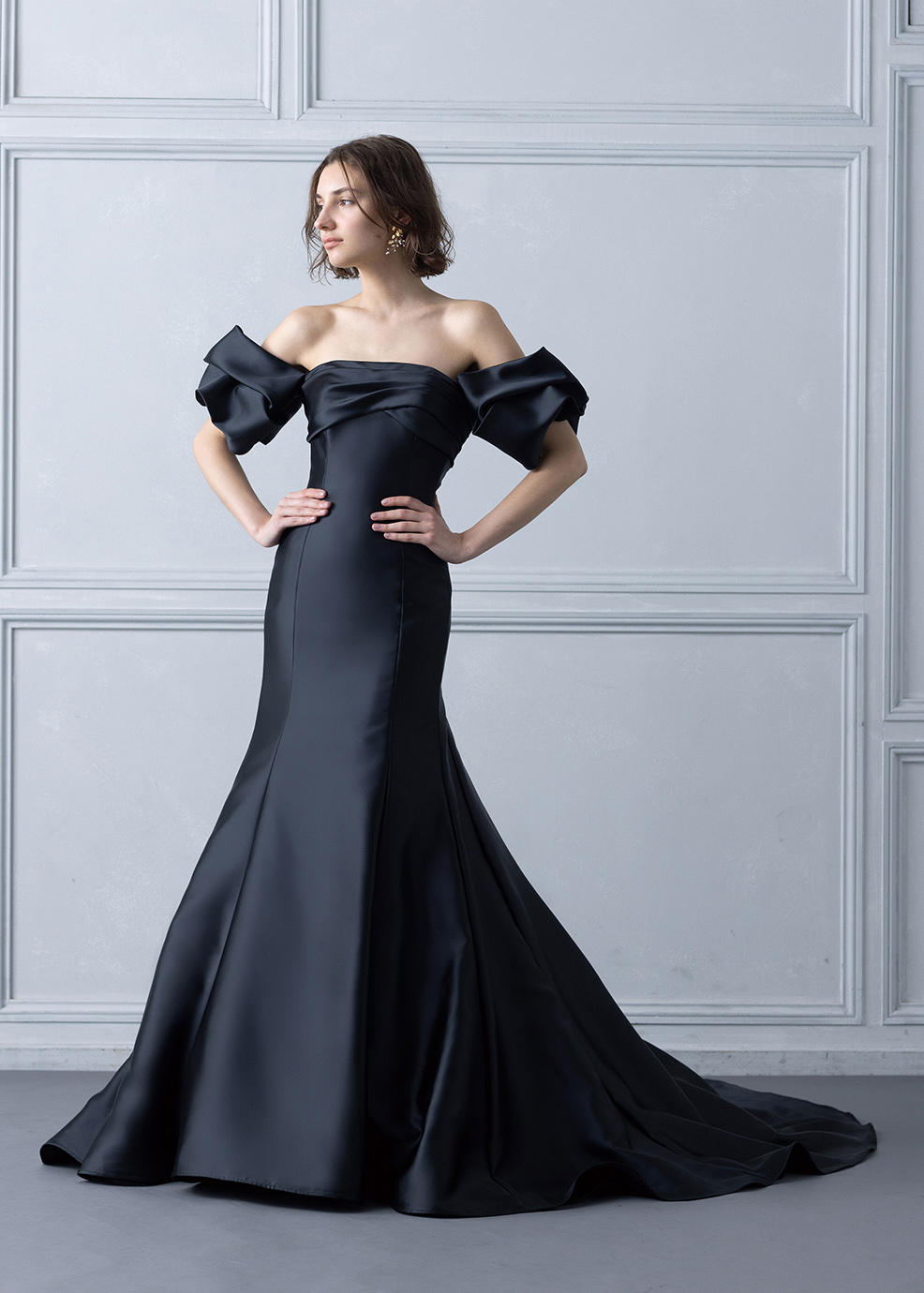 クチュール的なパフスリーブが特徴のスタイリッシュなマーメードスタイル。美しい曲線美とスタイルアップ効果を追求し、よりきれいに見せる2サイズフリーを実現しました。カラーは発色が良く、深みのある色味がポイントです。