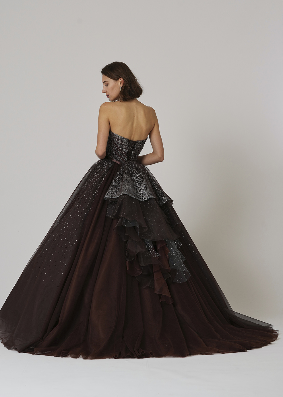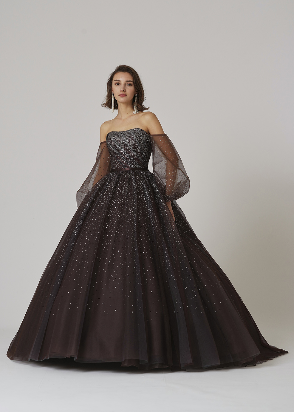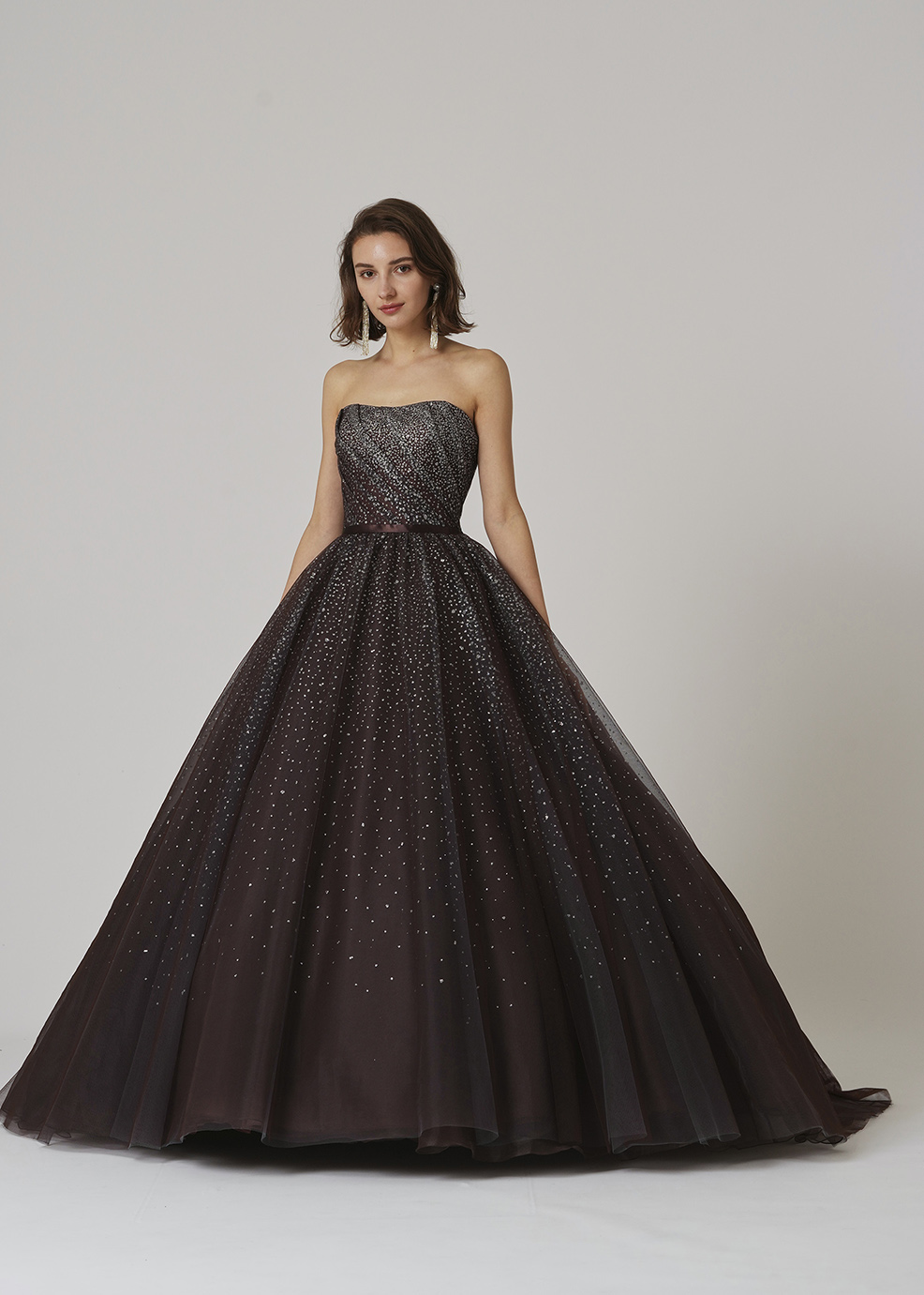 カカオのような深みのあるブラウンのドレス。ボディからスカートまで惜しみなく施されたグリッターは、宝石をちりばめたようにきらめきます。スタイルシルエットがよくみえるように、グリッターの多い部分を身頃からスカートに流れるように仕上げています。バックスタイルはフリルで華やかに仕上げました。