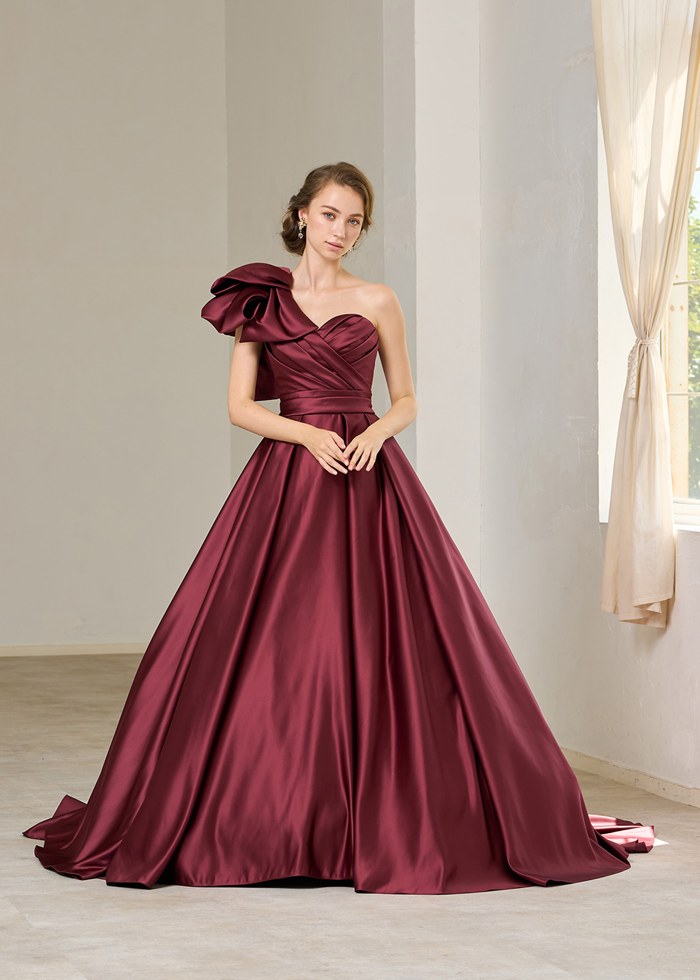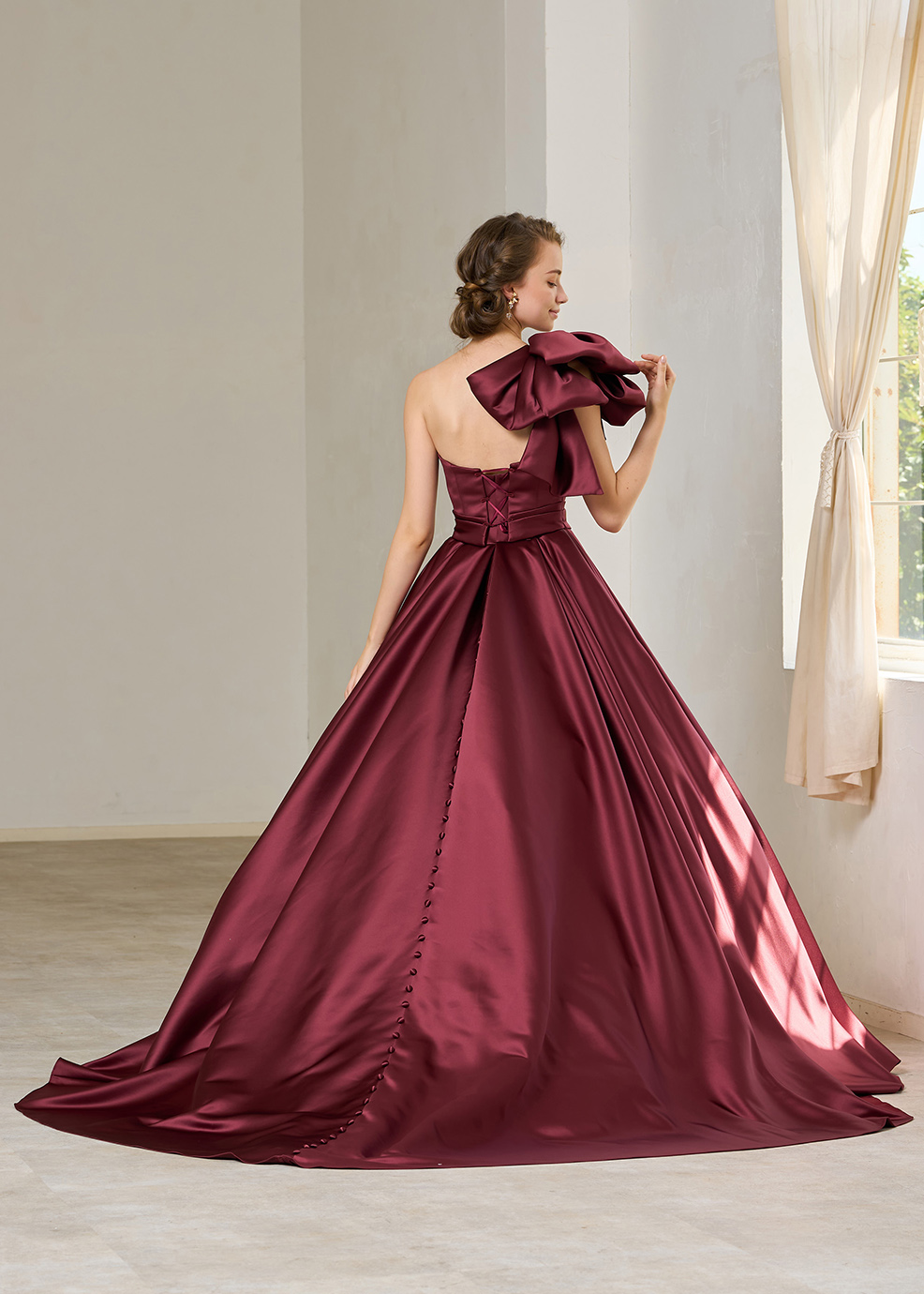 艶やかな光沢と重厚感のある素材が高級感のある一着。最新トレンドのビックリボンワンショルダーでモードに着こなせ、取り外すと美しいドレープが目を惹くビスチェタイプのドレスに変化します。バックスタイルのくるみボタンで後ろ姿にもポイントを。
