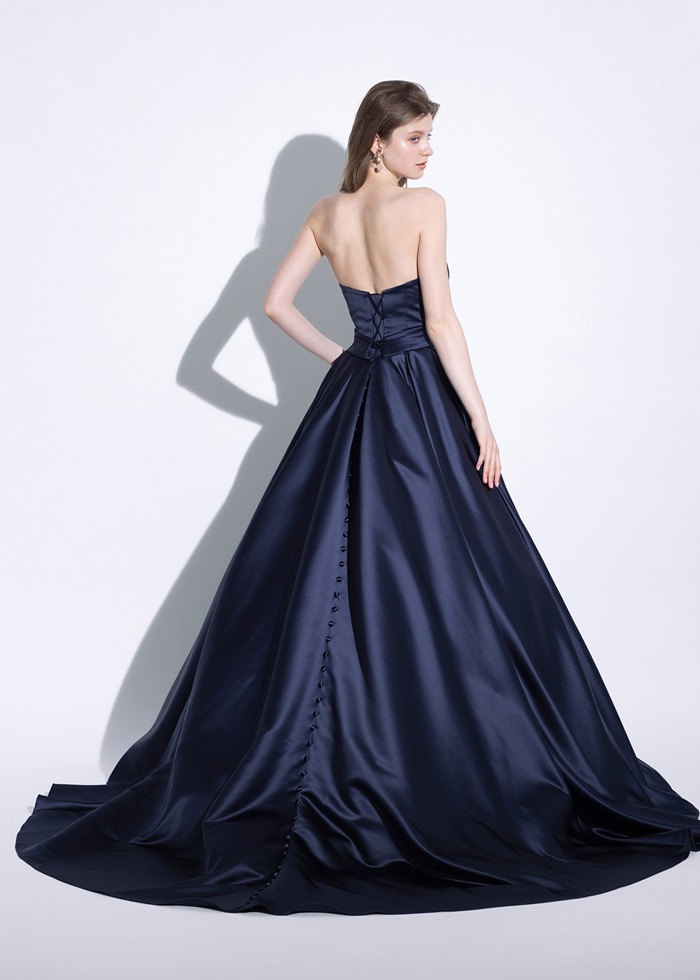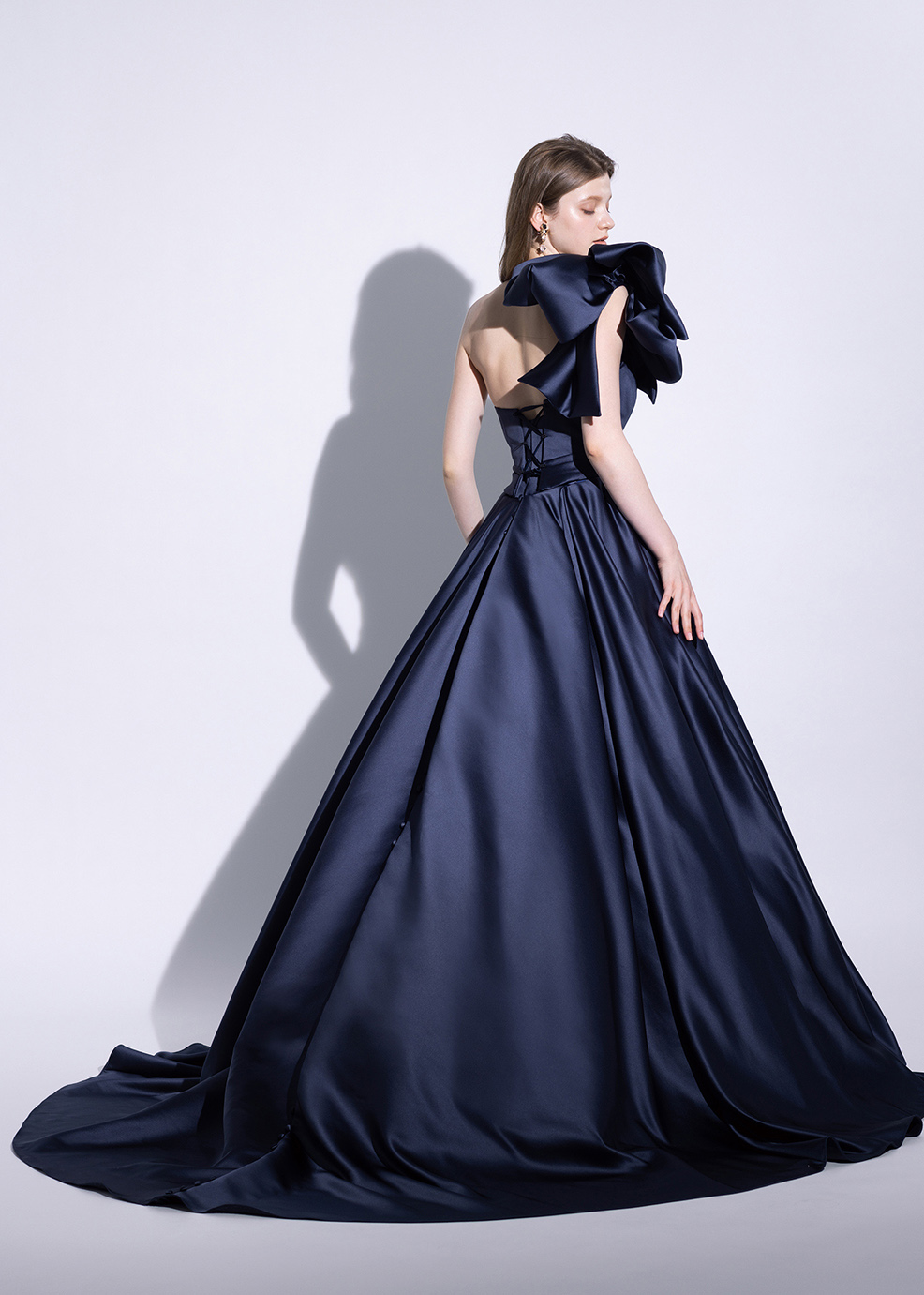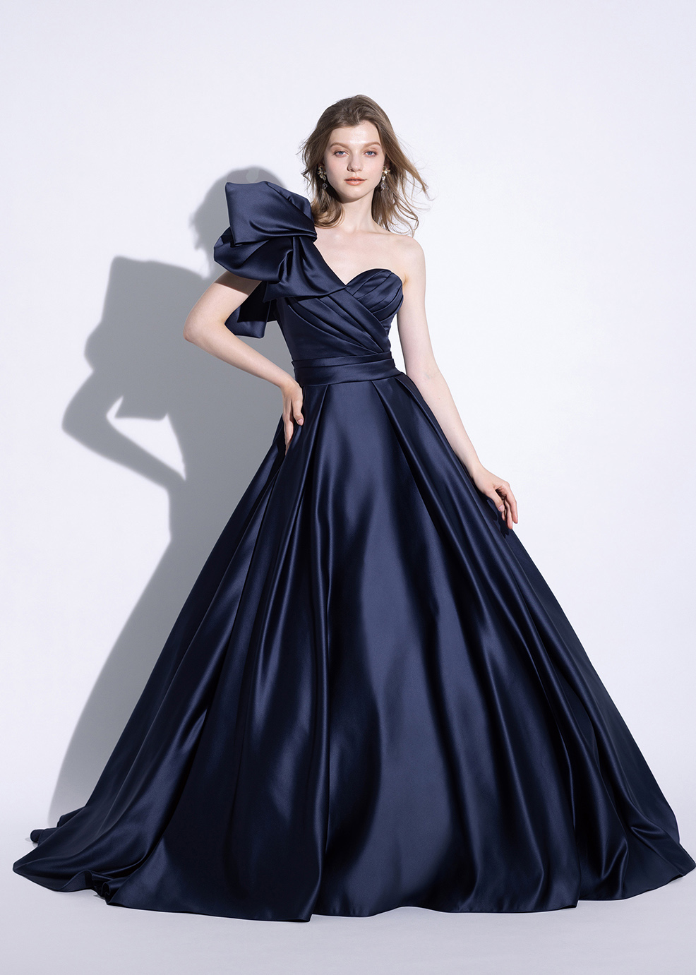 艶やかな光沢と重厚感のある素材が高級感のある一着。最新トレンドのビックリボンワンショルダーでモードに着こなせ、取り外すと美しいドレープが目を惹くビスチェタイプのドレスに変化します。バックスタイルのくるみボタンで後ろ姿にもポイントを。