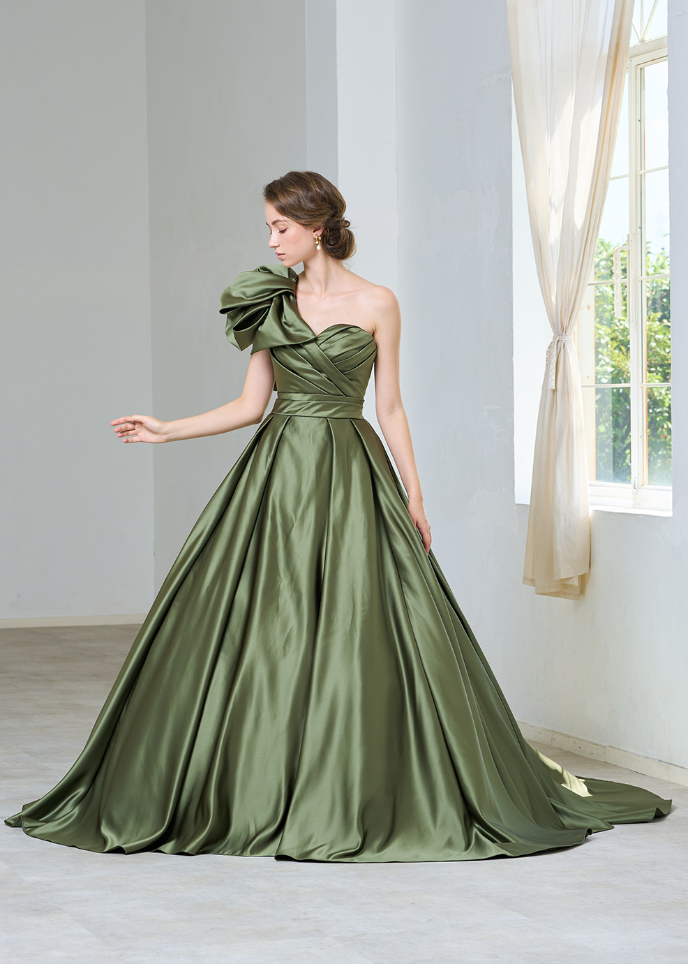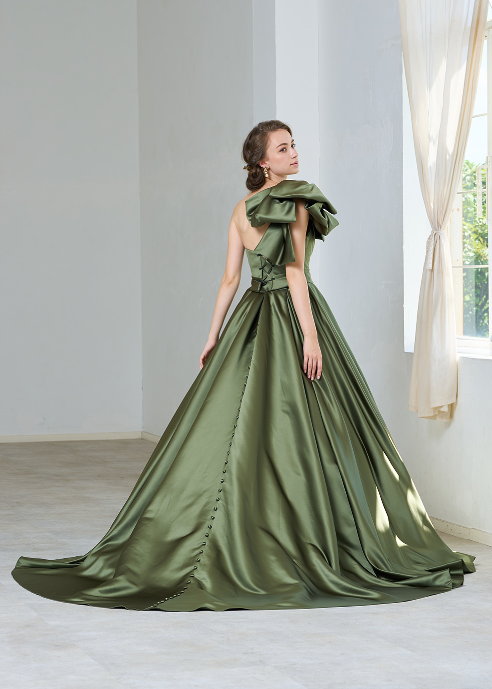 艶やかな光沢と重厚感のある素材が高級感のある一着。最新トレンドのビックリボンワンショルダーでモードに着こなせ、取り外すと美しいドレープが目を惹くビスチェタイプのドレスに変化します。バックスタイルのくるみボタンで後ろ姿にもポイントを。