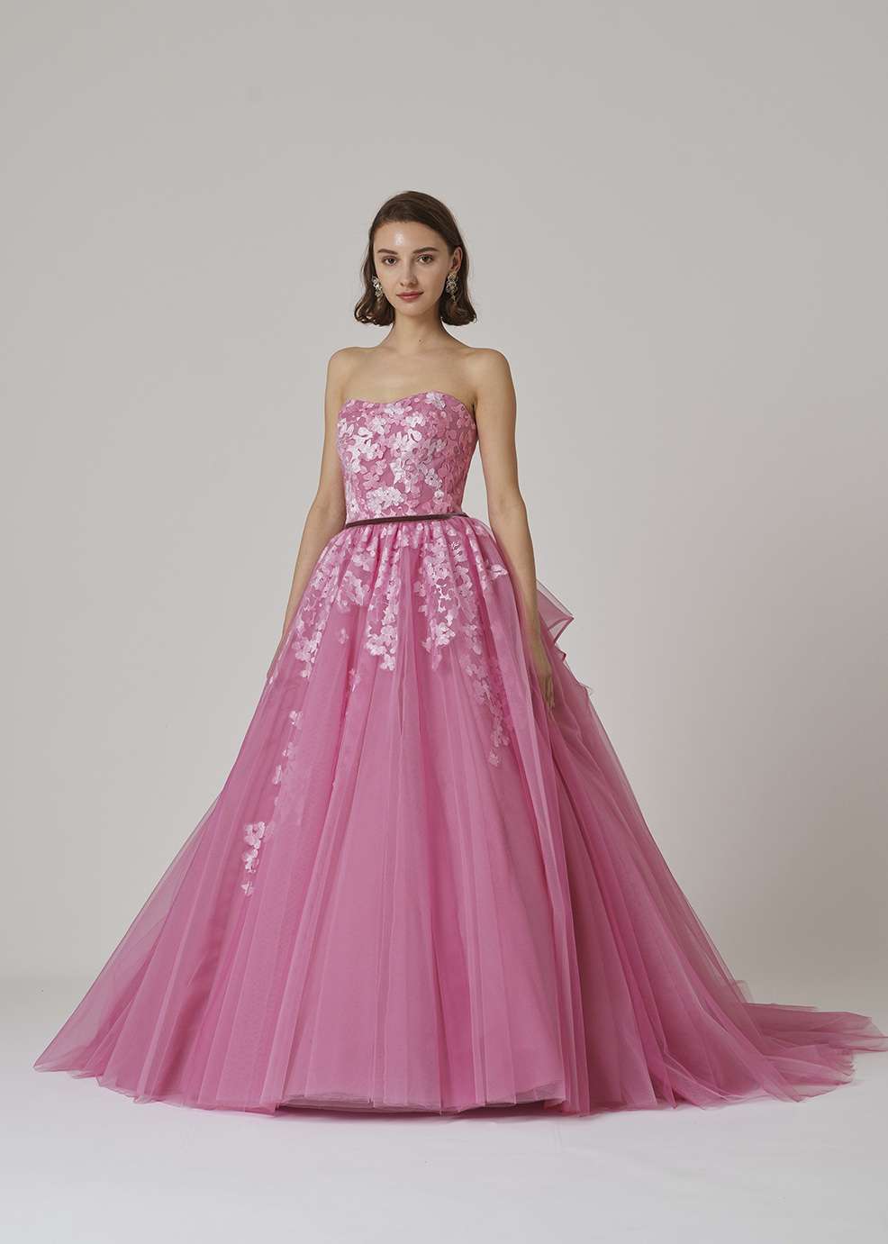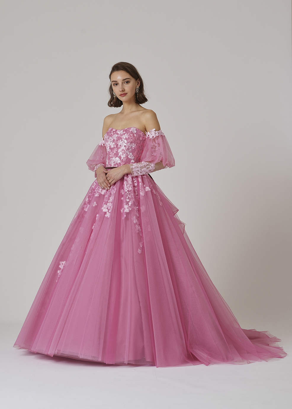 上品な柄いきのエンブレースが映えるAラインスタイル。トレンドのローズピンクをベースに、濃淡で染め分けたレースがほろほろと流れ、奥行きと透明感を演出します。ホットフィックスの輝きが動くたびに華やかさを添えます。
