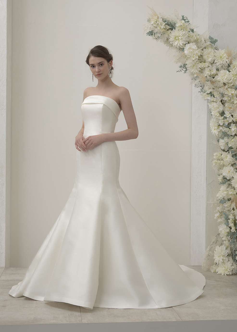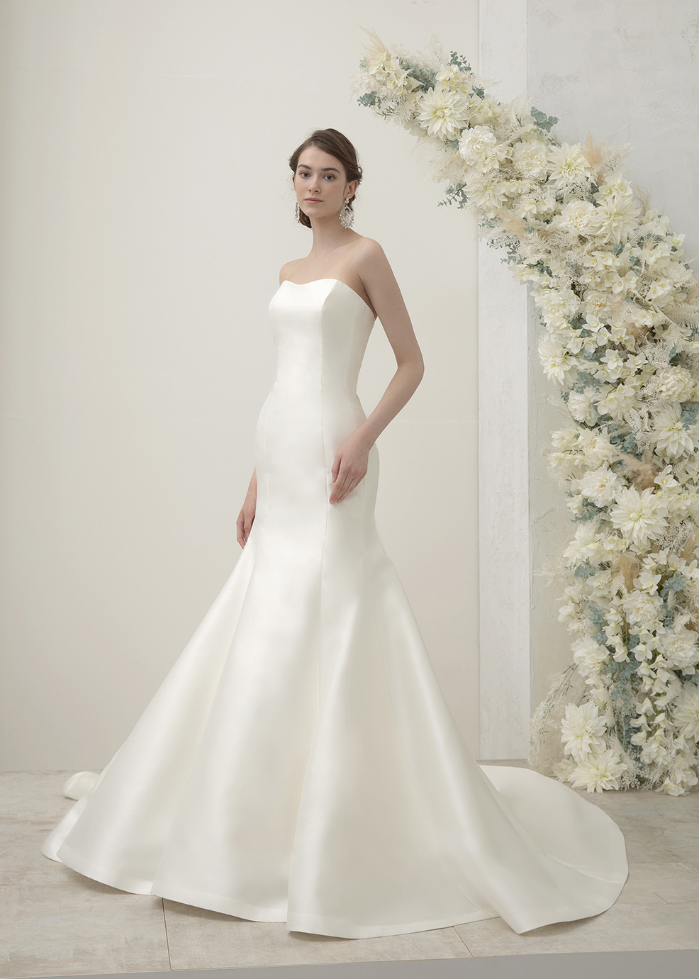 シンプルシックなミカドのマーメードは、シルエットにこだわり、上品さと華やかさを兼ね備えた1着に。シンプルだからこそ切り替え線や絞りの位置など、360度どこから見ても美しいラインにこだわりました。胸元のロールカラーは取り外し式で、プレーンなビスチェとしても着用いただけます。