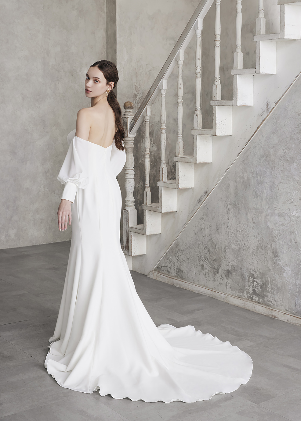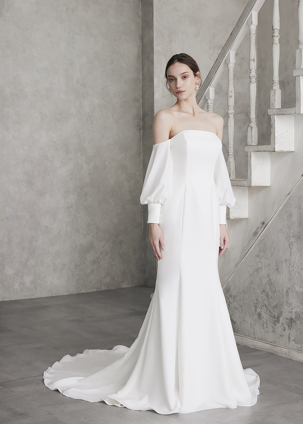 しっとりとした、しなやかさが特徴のパウダータッチデシンを使用したドレスです。オフショルダーランタンスリーブは、抜け感がありつつ、たっぷりとしたボリューム感がとてもオシャレなポイントになっています。デザインのワンポイントにパールボタンをプラス。ランタンスリーブは取り外し可能で、スッキリとしたソフトマーメイドドレスにもなる2way仕様。現代に合った洗練されたデザインが目を惹く1着です。