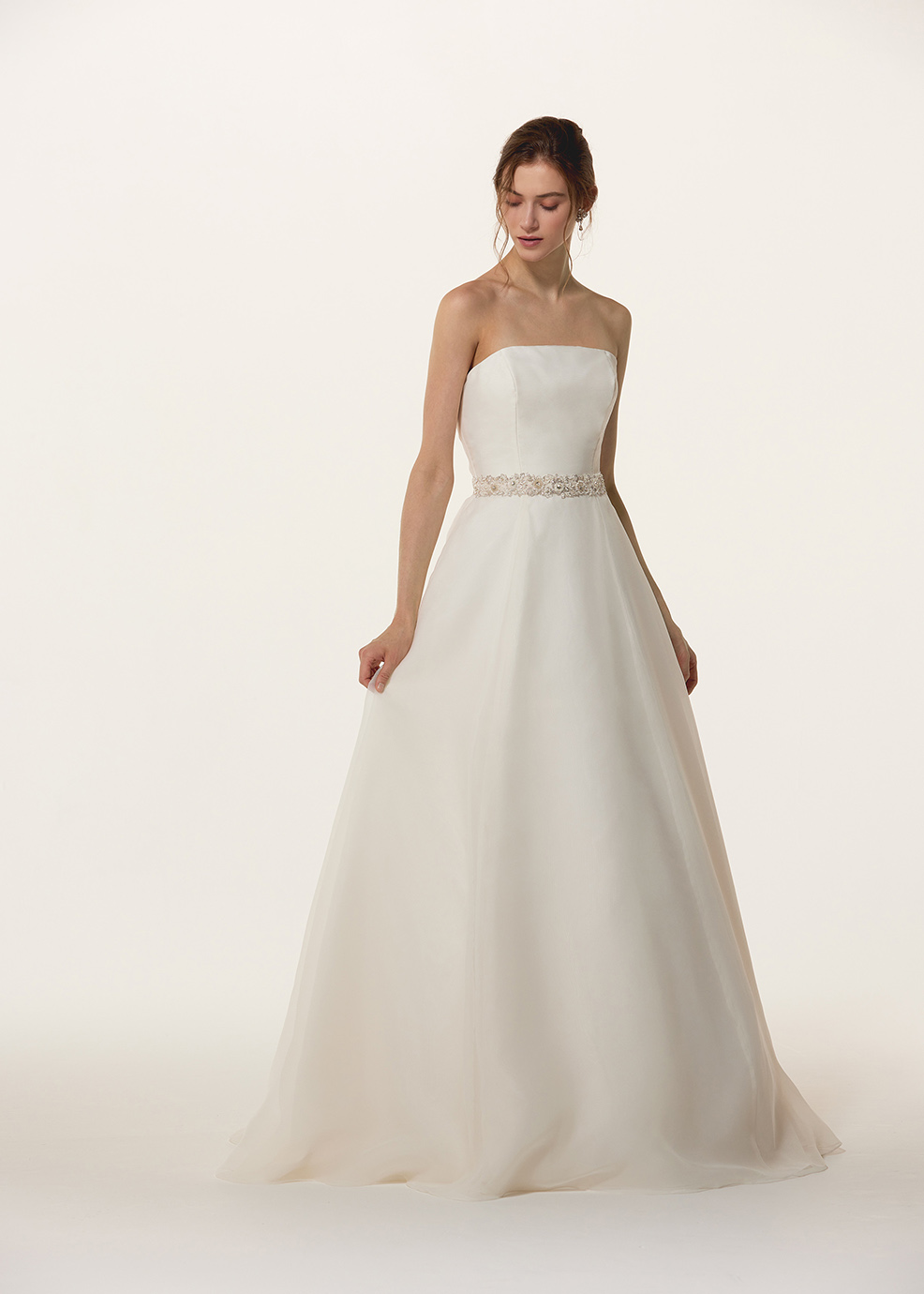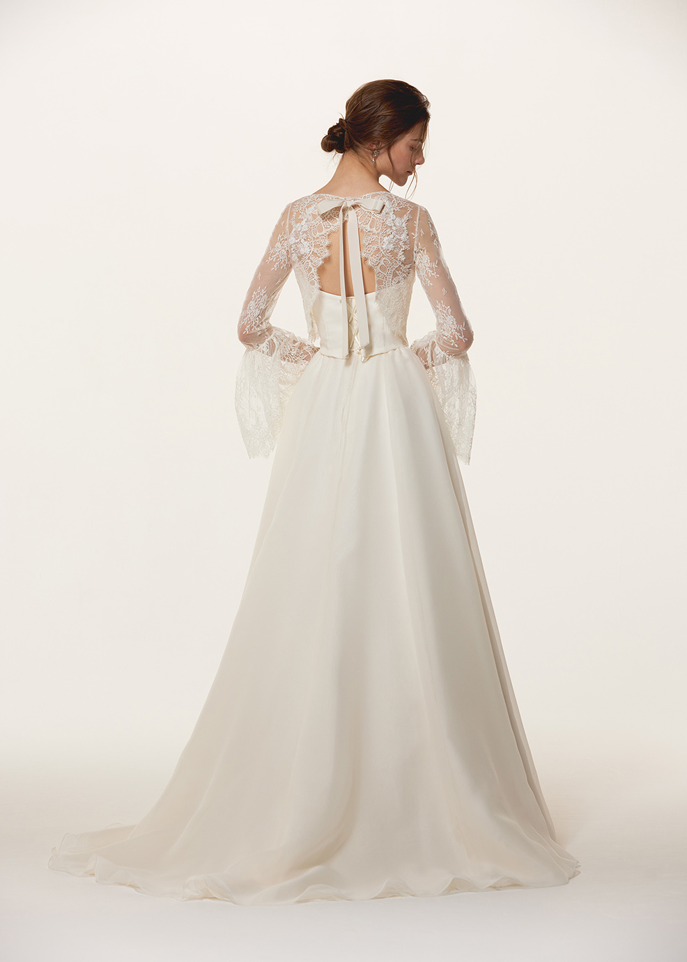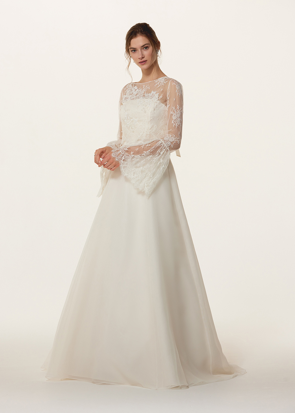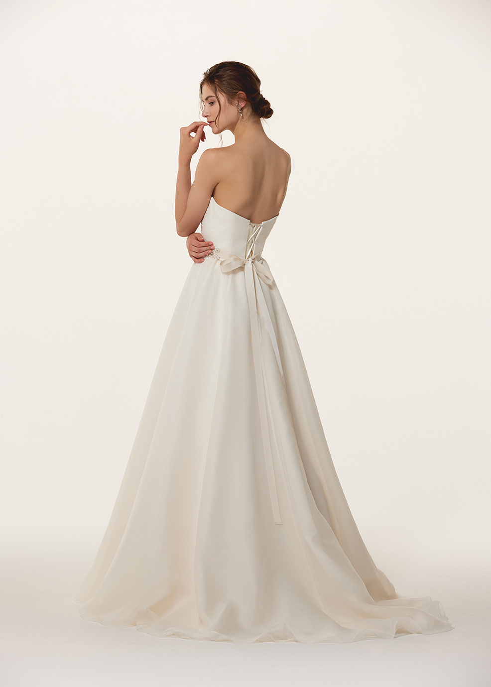 メッシュオーガンジーを使用したソフトAラインのドレスです。フランス製リバーレースを使用したボレロを着ることにより2Wayスタイルになります。オーガンジーの軽やかさとチュールの透明感が素敵なドレスとしても、繊細なレースのカットソーを着てクラシカルな雰囲気のあるドレスとしても楽しむことができます。ボリュームレスなので動きやすく、レストランやガーデンウェディングにも適しています。