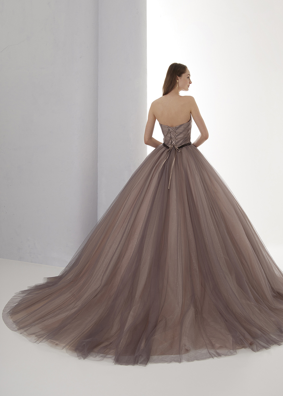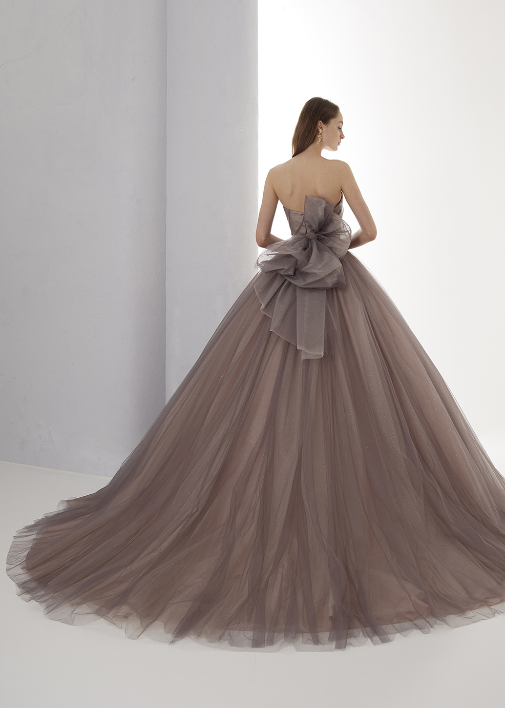 ラメチュールの品のある輝きが目を惹く大人ブラウンのドレス。ブラウンの色味とタックの美しさにこだわりました。大人っぽさの中にもラメチュールの輝きがプラスされることによって、より一層華やかな印象を与えてくれます。バックには取り外し可能な立体リボンがついており、バックリボンあり・無しでお好みの雰囲気で着て頂けるようになっています。