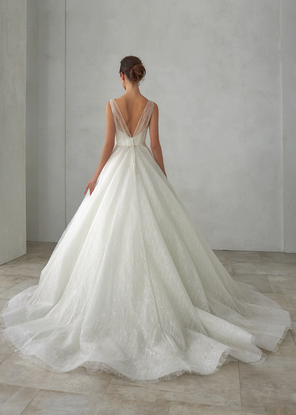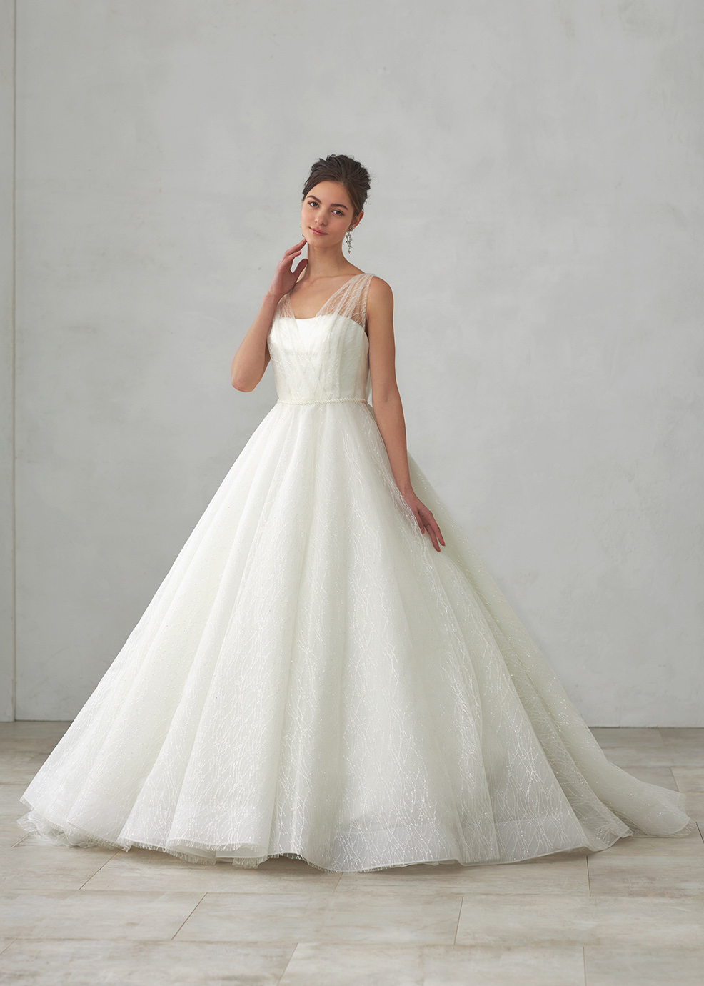 全身グリッターのAラインドレス。繊細な波のような柄のグリッターをドレス全体にふんだんに使用したドレス。スカートの重ねはサテンオーガンやチュールを使用し透明感を表現しています。オンショルダーの身頃もお肌の上にグリッターがきらめく印象でデザインしています。