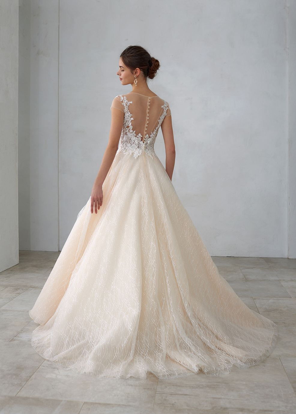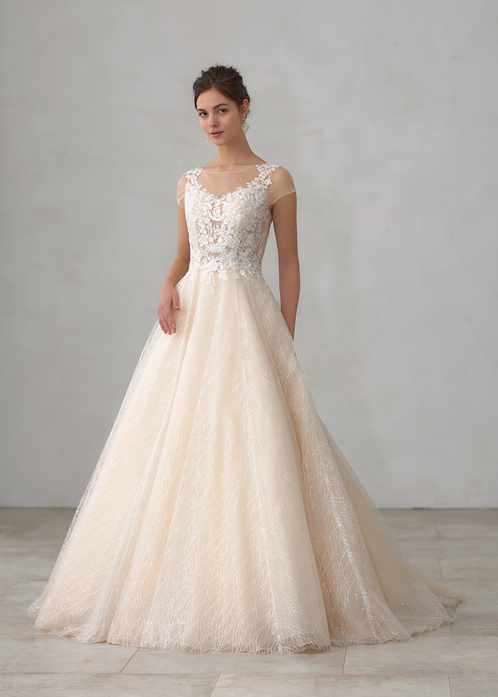 全身グリッター素材を使用し動くたびに輝きを放つ1着です。身頃はボタニカル風の繊細なレースを施し上品な印象をプラス。身頃はシアー感を表現し軽やかさと透明感表現し、レース柄が一段と美しく表現できるようにしています。柔らかな印象とグリッター柄が引き立つように、グリッターチュールの下にシャンパンカラーのチュールやオーガンジーを重ねました。