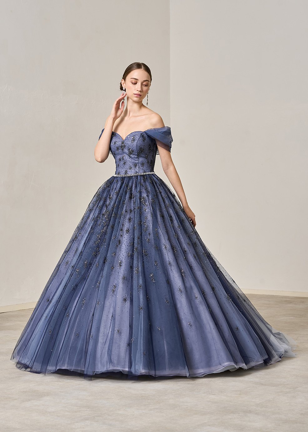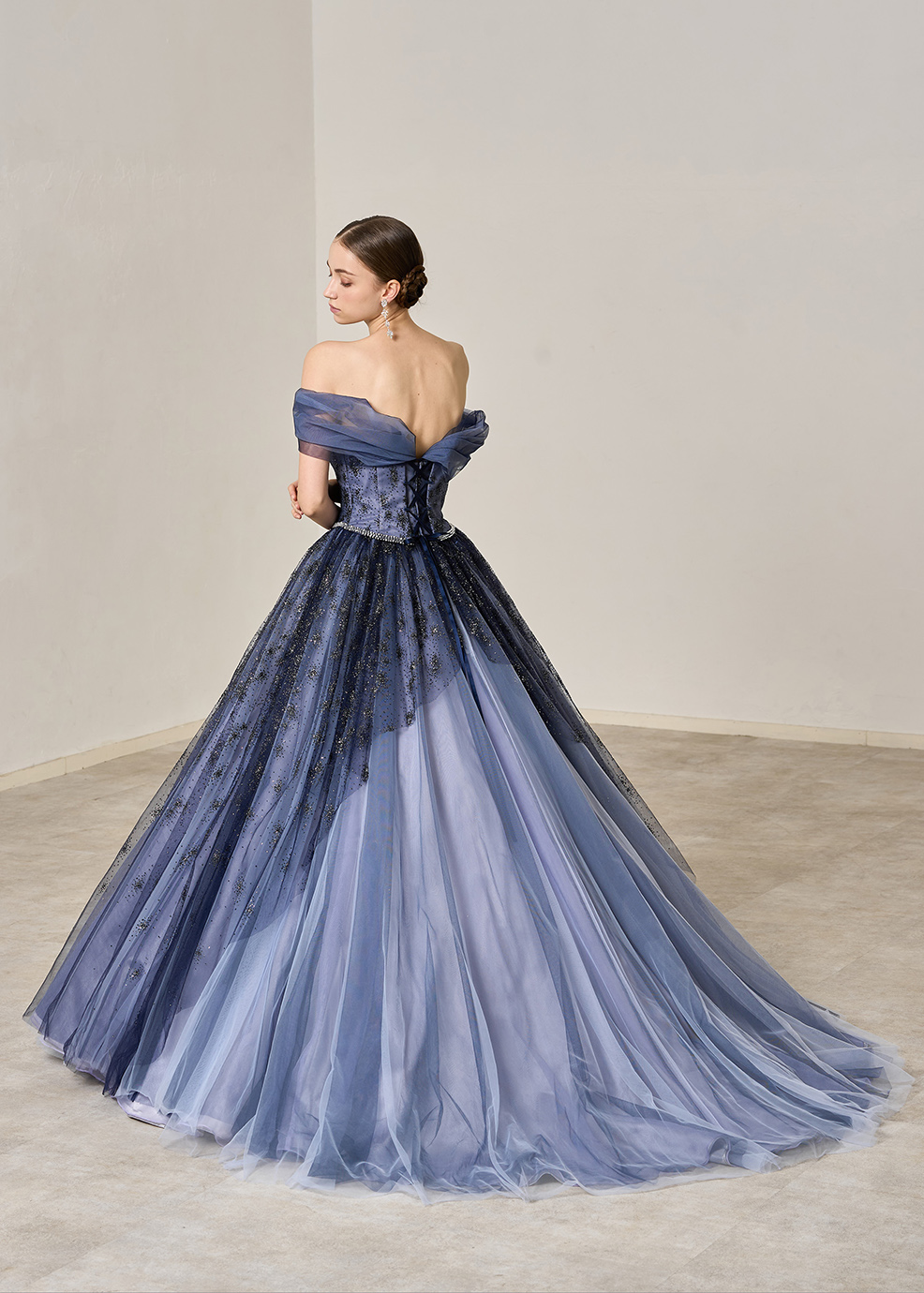 ネイビーブルーのチュールグリッターにラベンダーを重ね、色の重なりの美しさを表現したドレスです。グリッター部分はミッドナイトブルーを使用し上品な印象に仕上げました。胸元とウエストにクリスタルのビーディングをポイントで施しました。チュールを使用したたっぷりな印象のオフショルダーを付けるとトレンド感あるスタイルに変わります。