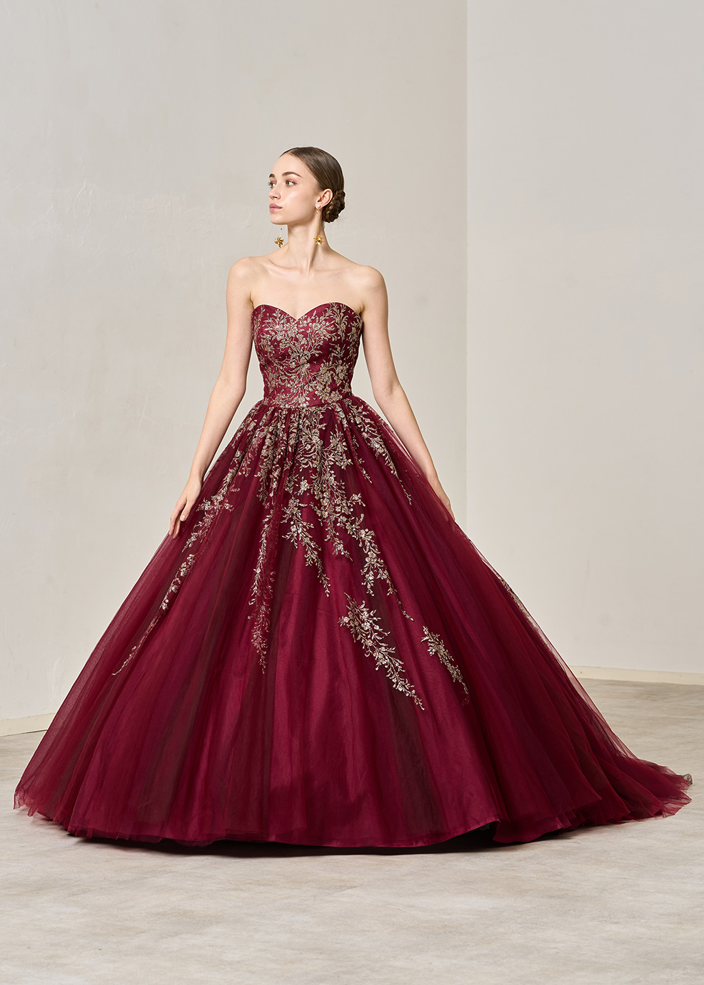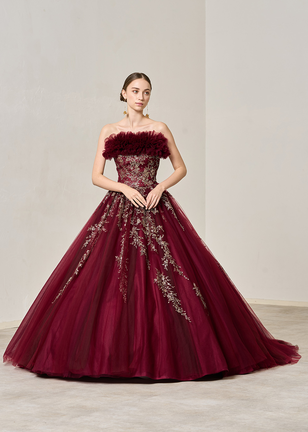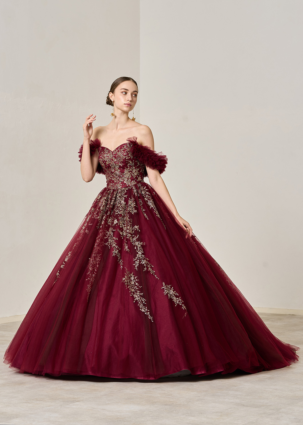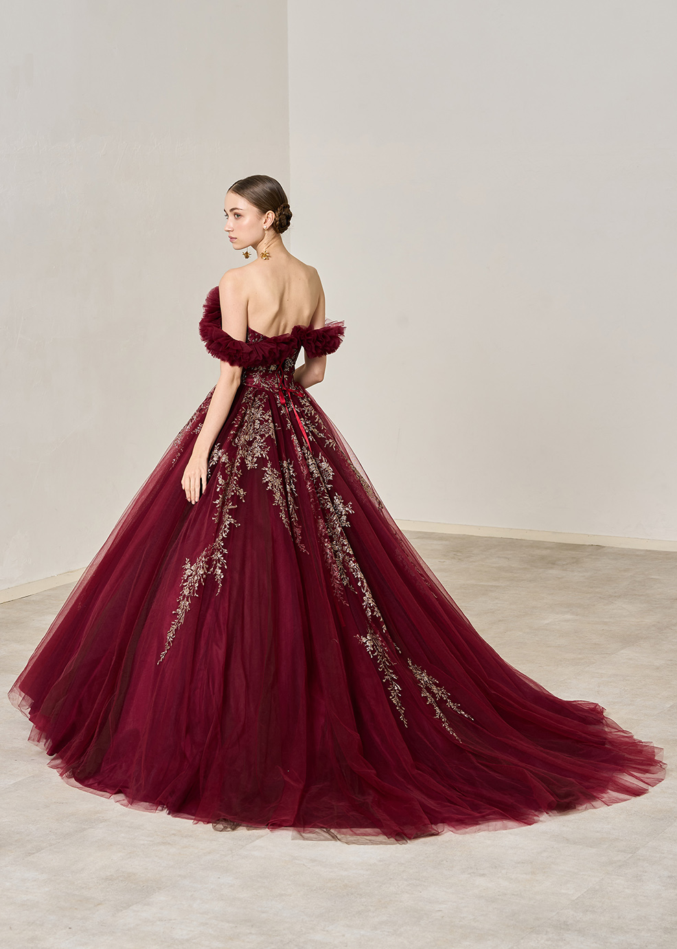 ゴールド・シルバー・ブラウンをミックスさせたグリッターが美しいきらめきを放つドレスです。チュールの色を絶妙に変えて深みのあるワインレッドを表現しました。フリルオフショルダーは2Way仕様になっており、オフショルダー同士を合わせると胸元に付けられるボリュームフリルに変身します。花嫁様のお好きなスタイルを楽しめる一着です。